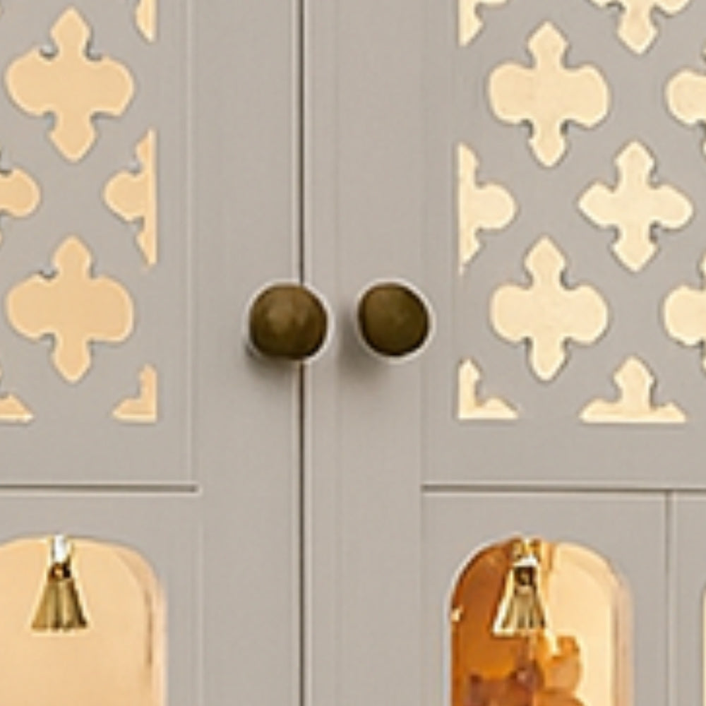 The doors of this pooja mandir have small arched cutouts that let soft light enter the temple, giving it a gentle and peaceful glow. Each cutout is neatly made in the same size and shape, which keeps the design balanced. These small openings also let the idols inside be seen slightly, which adds beauty and charm to the wooden temple. This feature makes the temple appear more lively and detailed without adding extra decoration. The smooth surface around each frame shows neat workmanship. It gives a traditional charm that matches well with the white color structure of this home temple. The symmetry in the cutouts brings a sense of order and peace to the design.