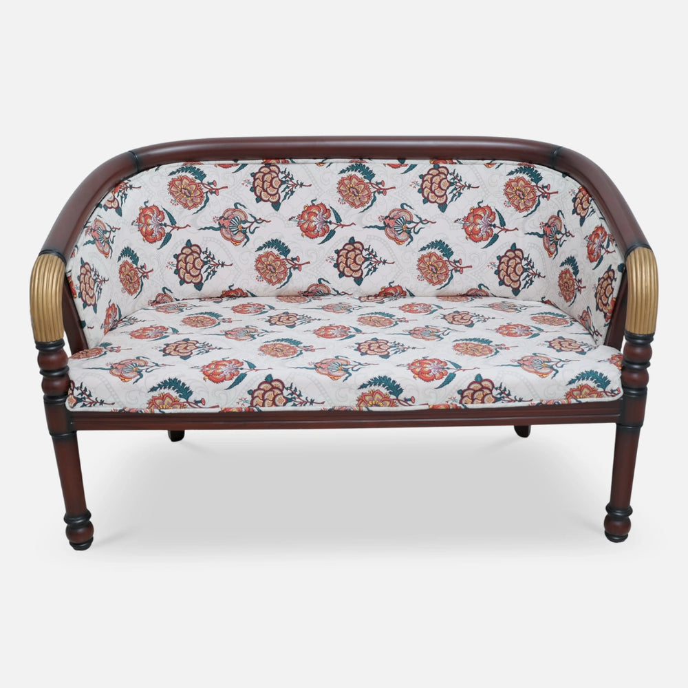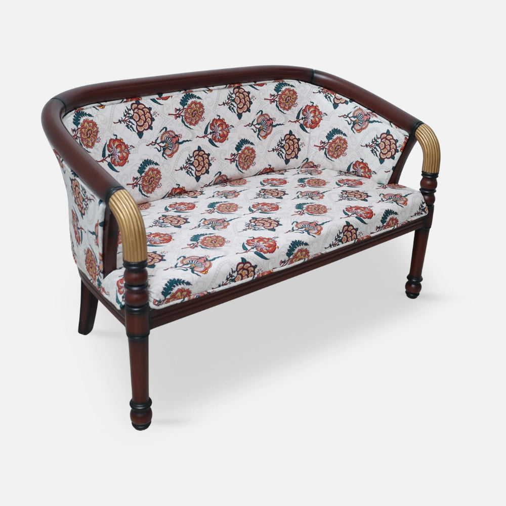 The Nami Solid wood Love Sofa is a comfortable and fashionable two-seater which is made of solid wooden frame with a brown color. The frame is curved around the backs and the legs, smooth and graceful. There is a nice touch of gold at the ends of the arms that make the design shine. The seating and back are upholstered with smooth cloth in fine paisley print in beige and brown . The combination provides a cozy and elegant look. The stitching and the finish of the upholstery are clean and well-done. The turned wooden legs also give some traditional feel without rendering the sofa loose and unsteady. The natural shine of the wood is amplified by the smooth polish, which makes the wood easy to maintain. The design is a mixture of classic and modern features and so can be used in living rooms and in lounges. This love sofa is attractive, comfortable, and classy to any house but still robust to use on a daily basis.