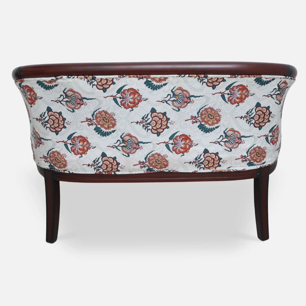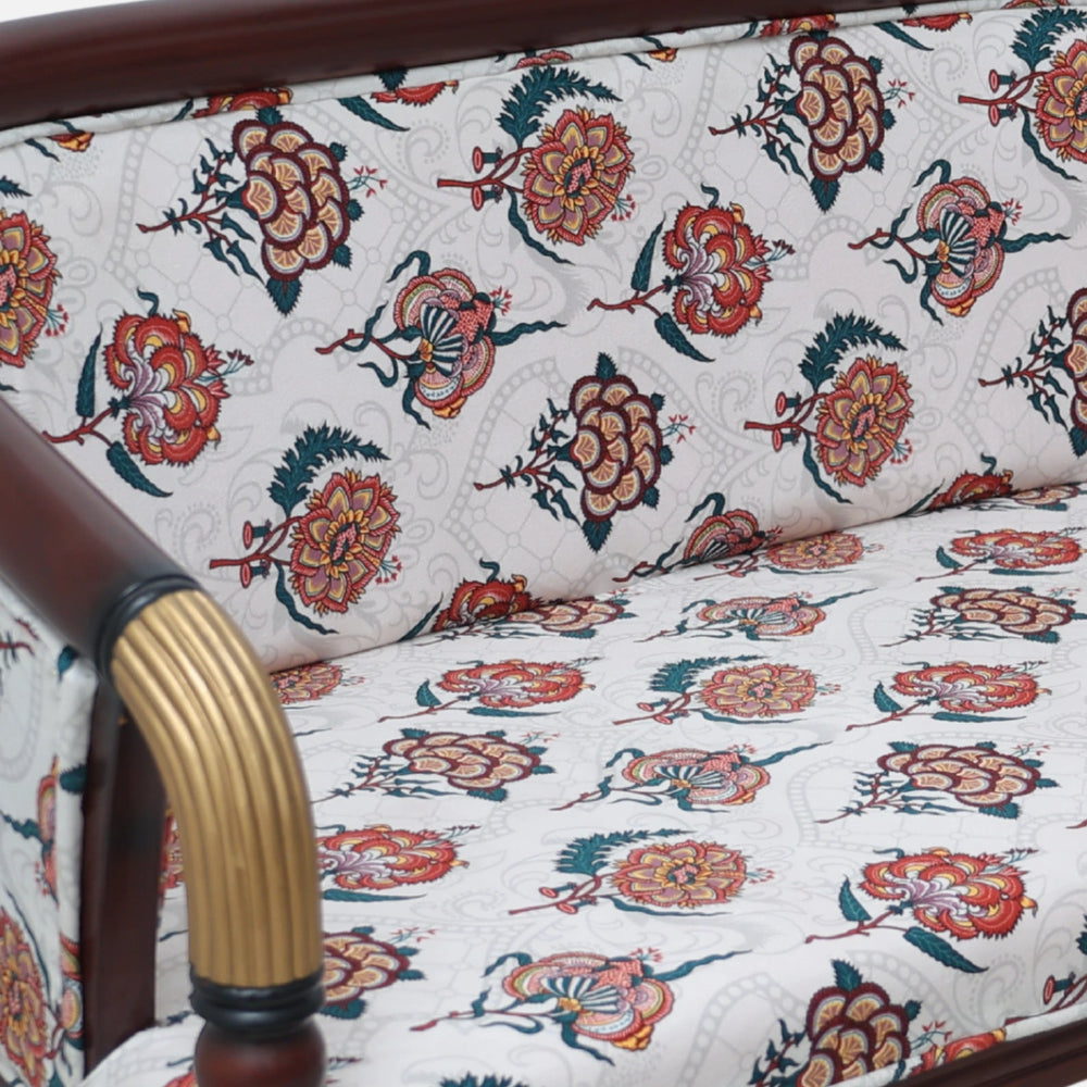 The upholstery has a beautiful paisley pattern in light beige and brown shades. The fine design gives a mix of traditional and modern style. The fabric is fitted tightly, which makes it strong and long-lasting. Its soft texture makes the seat comfortable for long sitting. The pattern adds depth and charm to the wooden sofa. The design repeats evenly on the seat and backrest, keeping the look neat. The light colors match easily with many room styles. The stitching is straight and clean. The sofa is paisley printed to give it a rich and classy appearance. The elaborate fabric construction gives the touch of class and makes the sofa a highlight of any room.