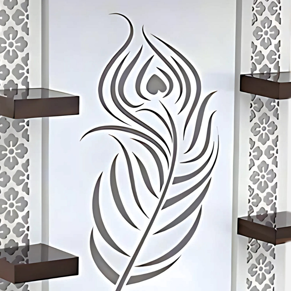 A big peacock feather cut out is used in the back panel of this pooja mandir and this is the key point of the design. The feather pattern is beautiful and it also provides the temple with a serene and graceful appearance. The architecture introduces a religious feel to the mandir without complicating the design and making it modern. The laser-cut details are neat and clear which show fine craftsmanship. The white background makes the feather design stand out well. The shape of each feather line gives a smooth flow to the structure. The cut lines are polished and easy to clean. This peacock feather symbolizes purity and devotion and makes the design meaningful for any home temple.