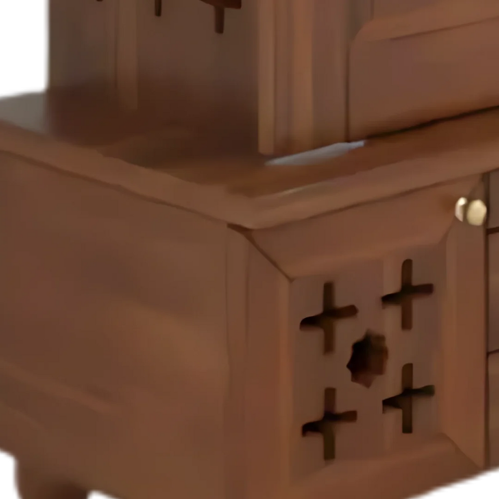 The deep teak finish of the Omkaram Mandap gives it a dignified and warm appearance. The natural teakwood grain is subtly visible beneath the smooth polish, offering texture and character. Brass bells, knobs, and handles contrast beautifully with the dark base, adding visual richness. When lit with a diya or candle, the carvings cast soft, moving shadows across the space, enhancing the spiritual experience. This finish not only preserves the mandap’s beauty but also makes it easy to clean, maintaining its charm for years.