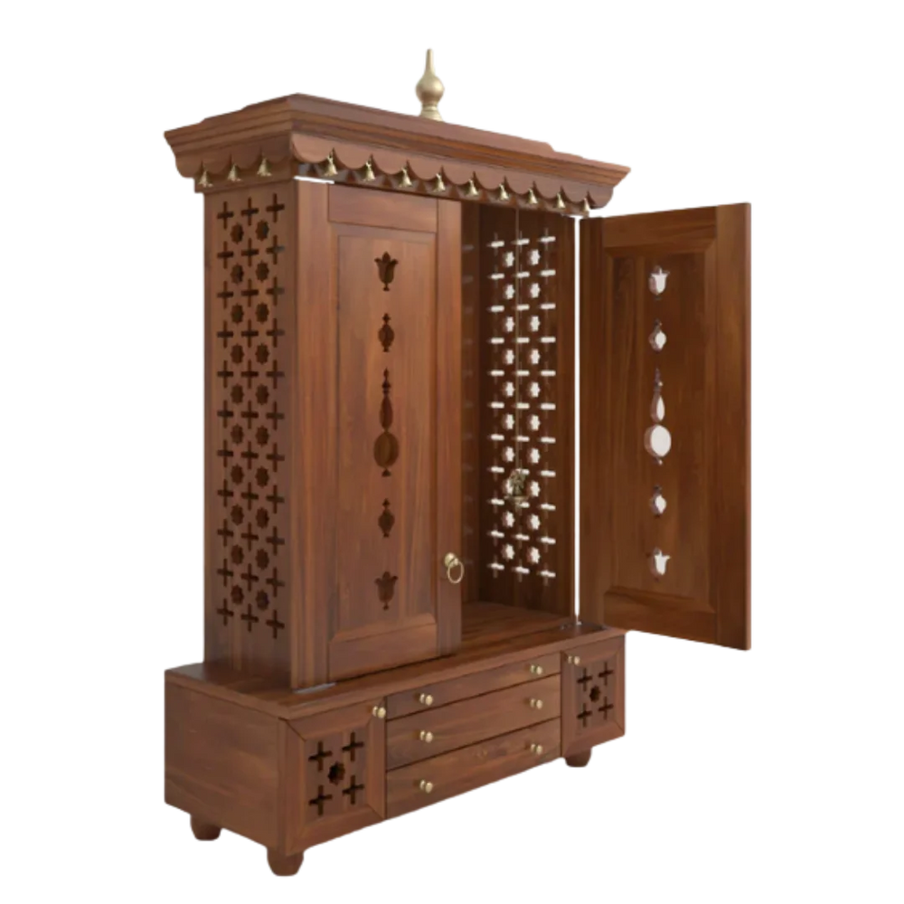 The Omkaram Pooja Mandap is a beautiful example of traditional Indian design blended with spiritual functionality. Made from solid teakwood, this floor-rested big mandir for home features a crown dome topped with a single large finial, scalloped wooden edging, and brass bell accents that give it a temple-like presence. Its door panels are adorned with symbolic tulsi, lamp, and kalash-shaped cutwork, while the sides include deeply carved cross-style jali panels that promote ventilation and create divine symmetry. The warm teak polish enhances the richness of the grain and complements the golden brass fixtures across the body. The lower cabinet is thoughtfully built with three central drawers and two hinged side compartments. Each section is designed to organize pooja items and keep your space clutter-free, supporting both daily rituals and festive occasions. Inside, the pooja platform offers generous space for multiple deities and sacred items. With its temple-inspired form and structural strength, the Omkaram Mandap becomes a meaningful and lasting element of your spiritual setting.