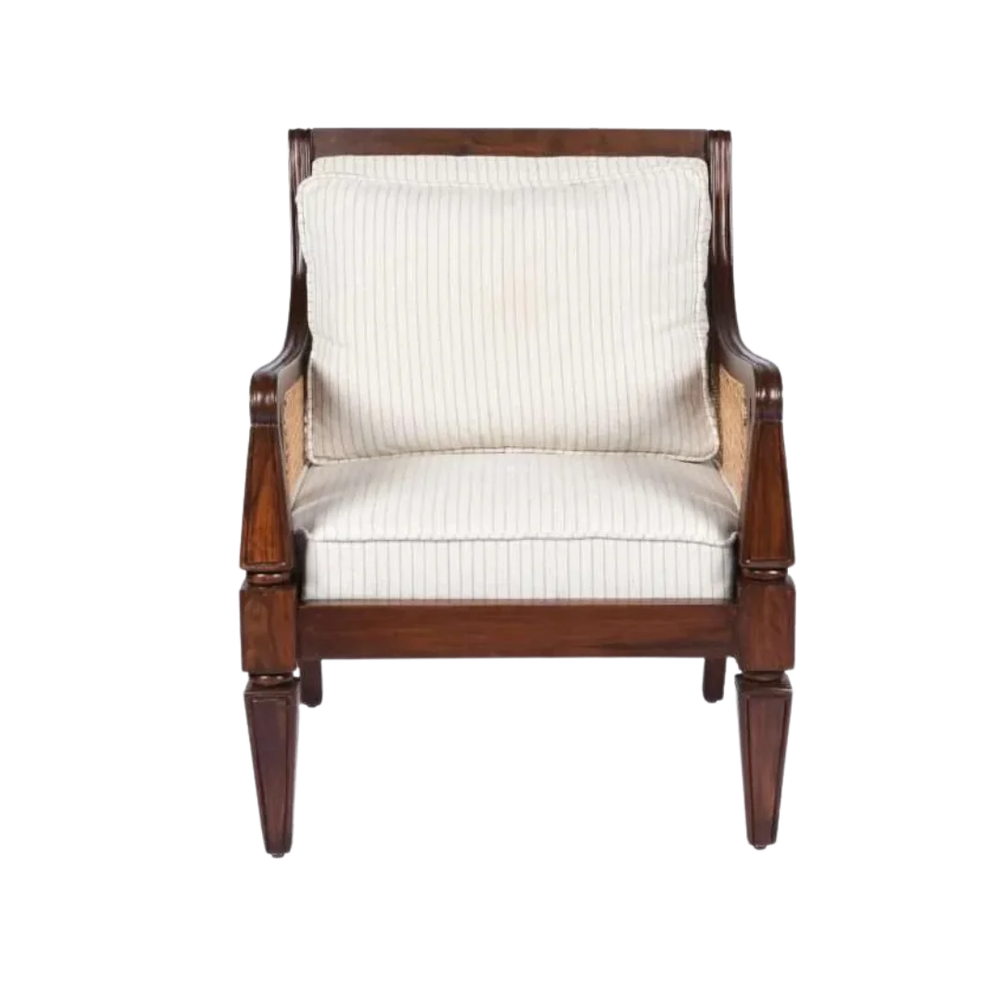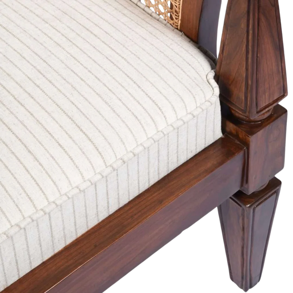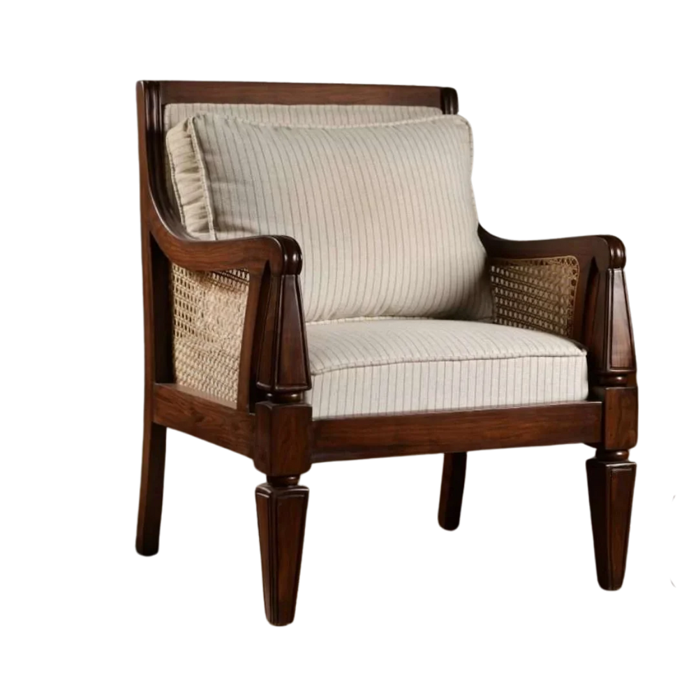 Teakwood armchair with cane accents, striped cushions, modern elegance.
