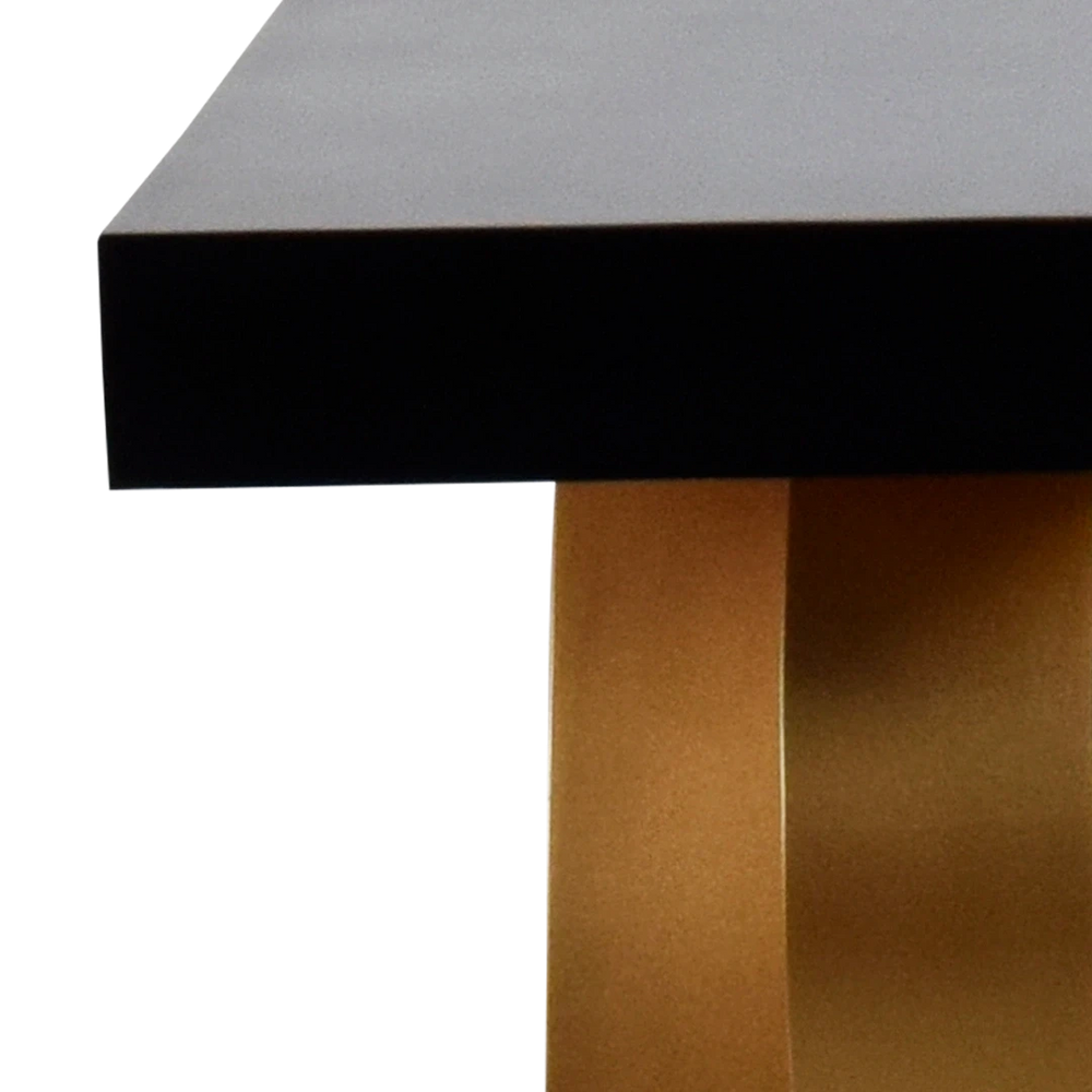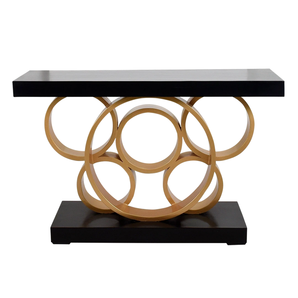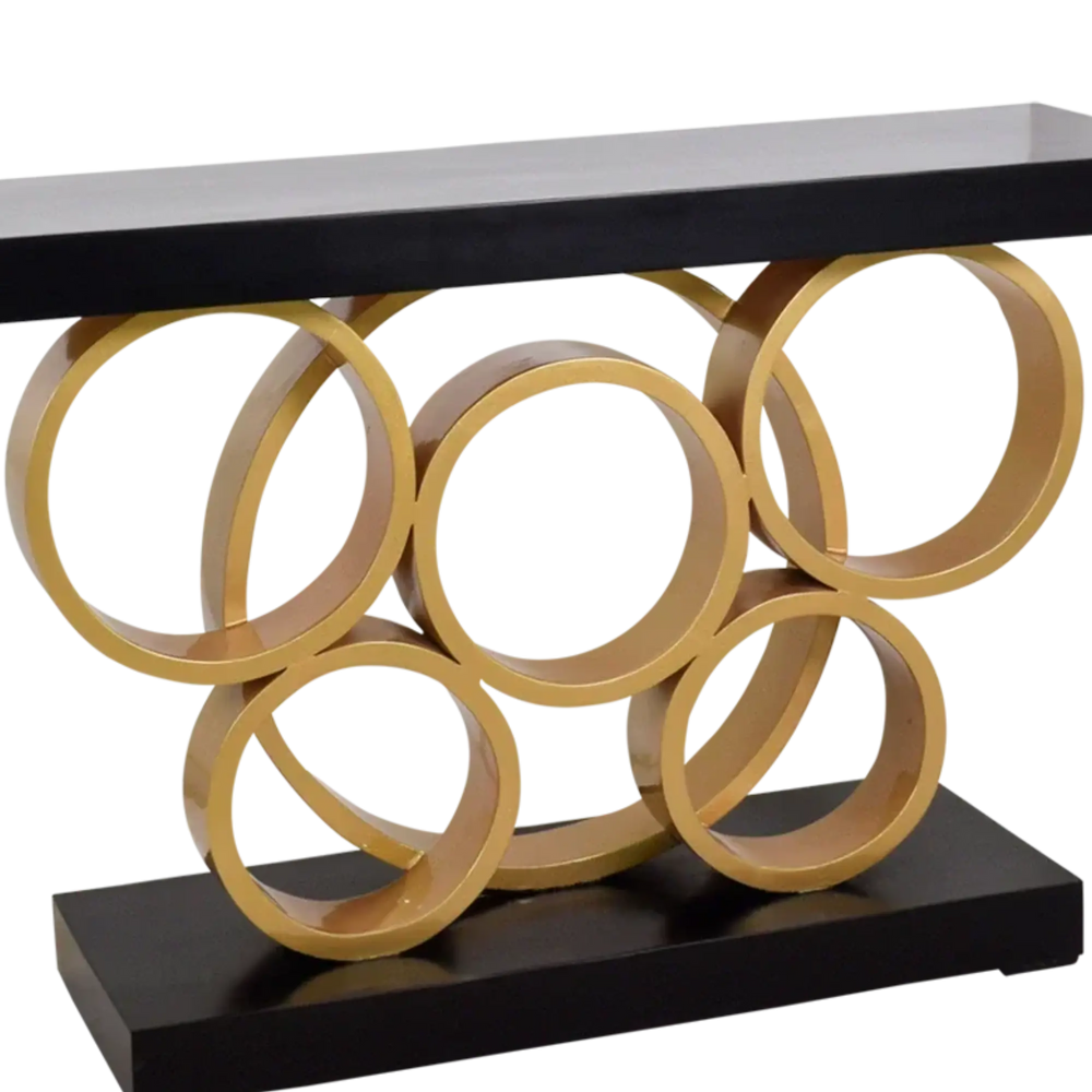 The Pique console table features an artistic circular base design that immediately catches attention. The overlapping gold circles give the table a modern yet elegant appearance, making it a stylish addition to your space. This design brings a bold and unique character to any room. The round shape brings an elegant touch to your living space seamlessly fitting in with contemporary and traditional decor. The smooth black surface contrasts nicely with the golden base elevating the table's overall look. With its solid construction, you can count on it being a lasting addition to your home style for many years ahead.