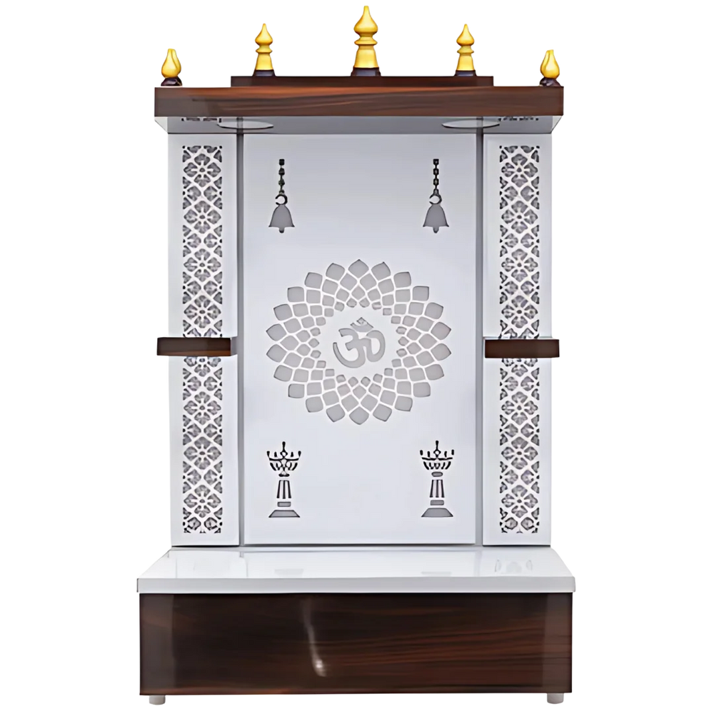 Prakasham wooden pooja mandir is a mark of divine serenity and a masterpiece of craftsmanship presented by DZYN Furnitures. The white color of the mandir gives a peaceful and pure feel. The hand-carved Om symbol diyas and bells make it look special and holy. The soft white color and the strong way the mandir stands on the floor do not try to stand out but still keep everything steady and in place. The mandir is 48 inches high, 16 inches deep, and 30 inches wide and is just right for any home. The Om symbol at the center, the golden projections at the top, and the carved bells and diyas on the sides are all created with care and are not too flashy. There are two small platforms on the two sides that feel like they are made for something personal. The drawer below, in a deep brown color, gives a nice contrast. The simple and smart design of the mandir makes it both useful and beautiful, just like it should be in a pooja place. It matches well with any home decor and leaves a peaceful feel in the room.