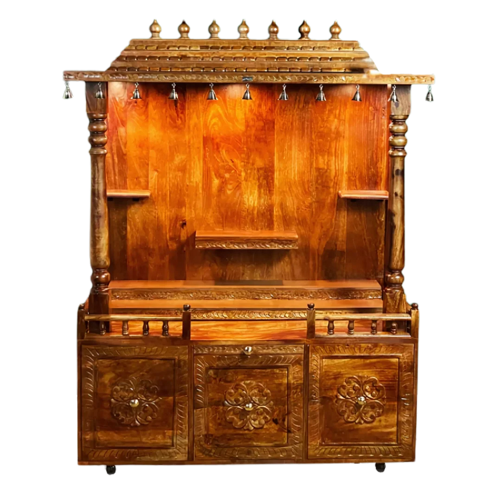 The natural shiny finish of this beautiful puja mandap not only makes it attractive but also keeps it safe from damage due to bugs and moisture. Additionally, this layer makes every line and grain of the wood clearly visible, which makes the mandap come alive. Its natural teak colour blends well with both traditional and modern puja spaces. This finish also protects the temple from dust and scratches. It also makes maintaining the mandap extremely easy. In every corner, every carving, every smallest detail, this mandap displays sanctity and simplicitywhich makes the puja place of your home very special.