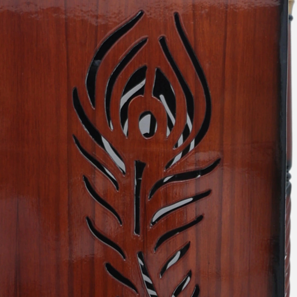 Both sides of this teakwood pooja mandir have cutwork designs in the shape of peacock feathers that match the main pattern. The open design keeps the structure light and adds a graceful look. The brown polish gives a smooth finish and highlights every curve. This side design completes the traditional style and gives the mandir a royal look from all angles. The shapes of the feathers provide the temple with some movement and balance. They also reflect soft light that adds depth to the sides. The pooja mandir appears to be balanced and artistic in this design. The fine detailing on the feathers shows the skill and care used in crafting this temple.