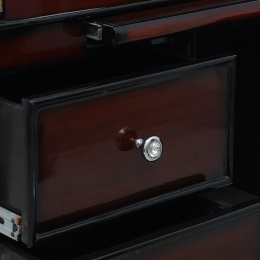 The base of this pooja mandir has two drawers and one cabinet that give enough space to keep all pooja items neatly. Each drawer moves smoothly and has a round metal knob that is easy to hold. The front surface has a shiny finish that matches the upper part of the temple. This area allows you to store the pooja items neat and clean and within reach whenever you need to use them. The large cabinet area is useful in keeping large pooja plates, as well as holy books. The drawers close and open silently because of the smooth channels. This base design contributes to the usefulness in addition to the balanced appearance to the entire temple.