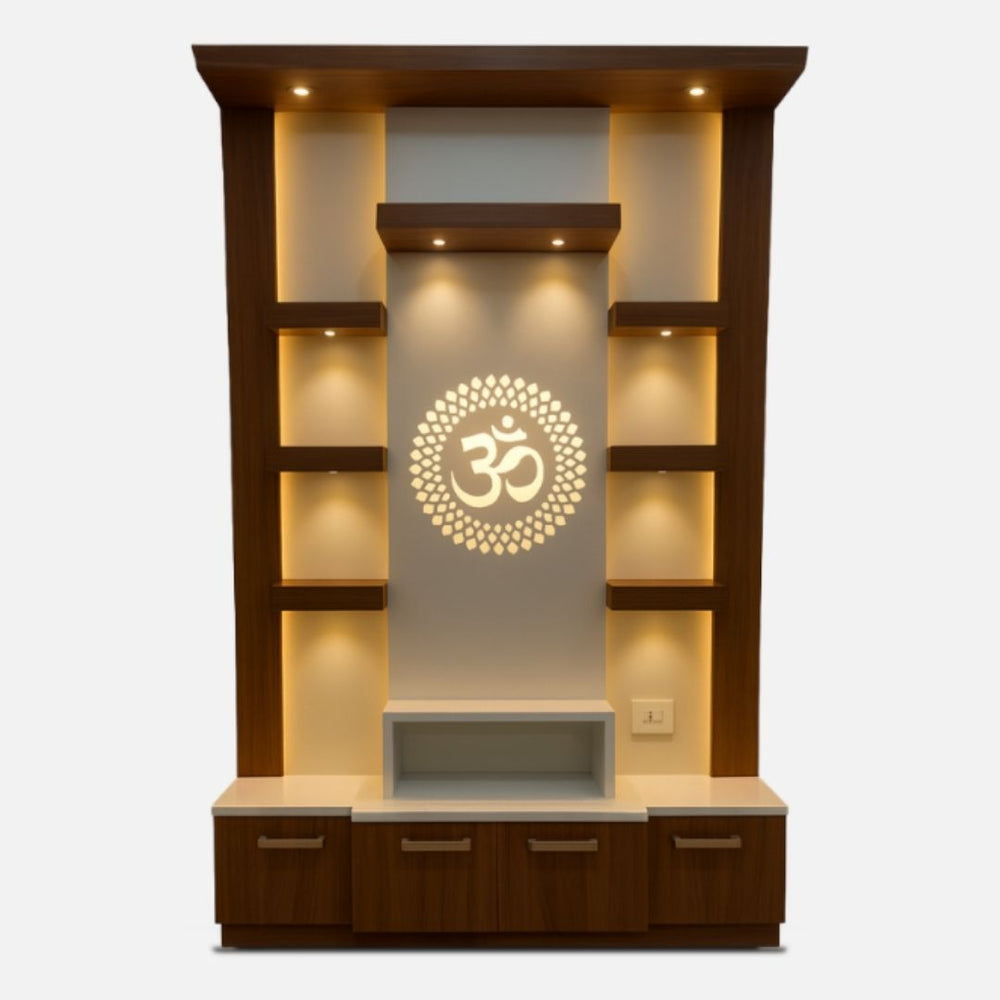 This mandap has inbuilt lights throughout the canopy and shelves making the place well lit to worship. The light gives a gentle ambiance to the mandap which not only adds spiritual effect but also highlights the structure of the mandap. The bulbs are also positioned strategically to evenly spread the light to give emphasis to the Om design and the symmetrical shelves. The warm lighting is a perfect match with the brown framing, providing the whole structure a modern appearance. In addition to aesthetics, the lighting enhances visibility, which makes this big pooja mandir very functional in terms of daily rituals and evening prayers.