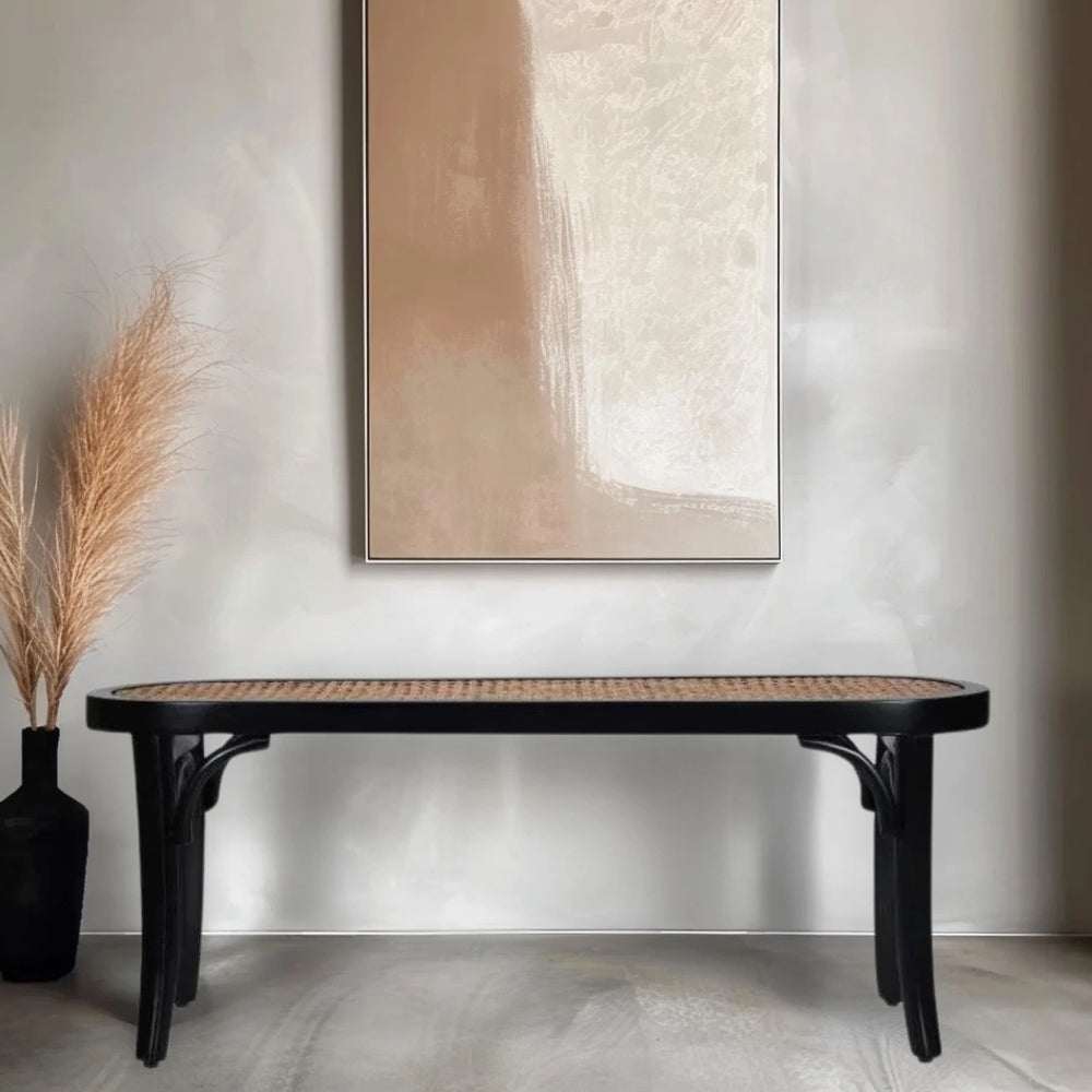 This Rattuna Teak Wood Bench is a slim bench that looks light and stays stable in any room. This bench has a strong teakwood structure and it feels firm when a person sits. This seat has an oval shape with neat cane weaving in a tight pattern and it supports the body well. This cane surface gives gentle airflow so the seat feels cool and comfortable in long use. This frame has rounded edges that look soft and safe for daily use. This bench has smooth curved supports under the seat that join the four legs and they give extra strength. These legs have a slight outward curve that keeps the bench steady on the floor and adds style. This surface has a rich black color finish that looks classy with modern decor and classic decor. This black color also highlights the natural cane at the top in a nice contrast. This Rattuna Teak Wood Bench suits living rooms, bedrooms, entry passages, cafes and waiting spaces and it gives useful seating without taking much space.