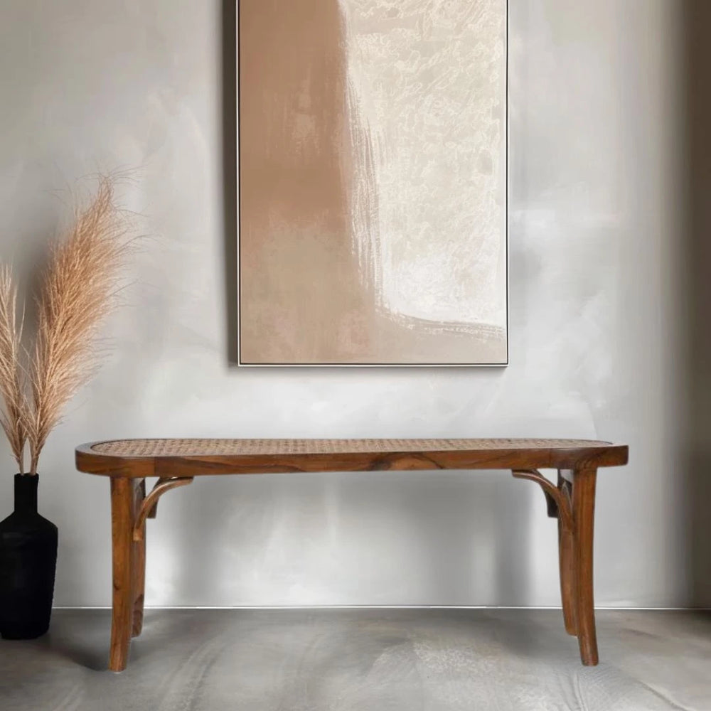 Teakwood bench with cane seat, elegant design, durable craftsmanship.