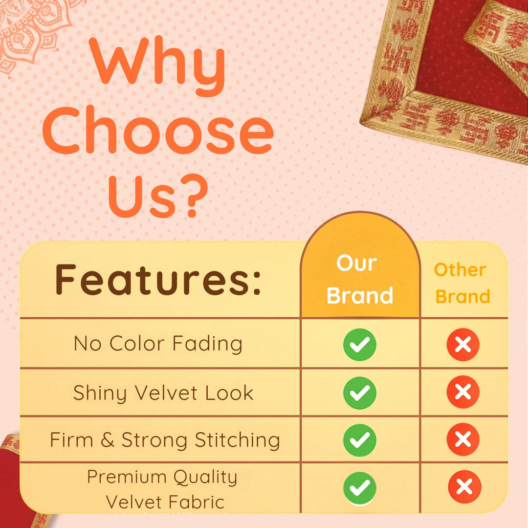 This red velvet pooja aasan glows with bright red light, and fills the mandir with a soft glow. The centre panel has smooth velvet that feels gentle under the palm, and keeps focus on the deity during every puja. A gold zari border trims all four sides, featuring repeating swastik signs and small kalash motifs that stand for good luck. A thin gold stripe lines the inner edge which keeps the square shape neat and straight. The corners of this aasan are strongly stitched to stop fray and keep the cloth flat without folds. Soft velvet threads hold diya, kalash or prasad plate steady so no item slips in prayer. A gentle shake releases any dust so daily care stays simple. Golden threads in the border catch lamp light and turn into a quiet halo that highlights every idol. The dimensions of this pooja aasan are 14 inch width and 14 inch length which lets it sit perfectly on chowki, mandir shelf or marble slab and serve as a pure seat for sacred idols or holy texts.