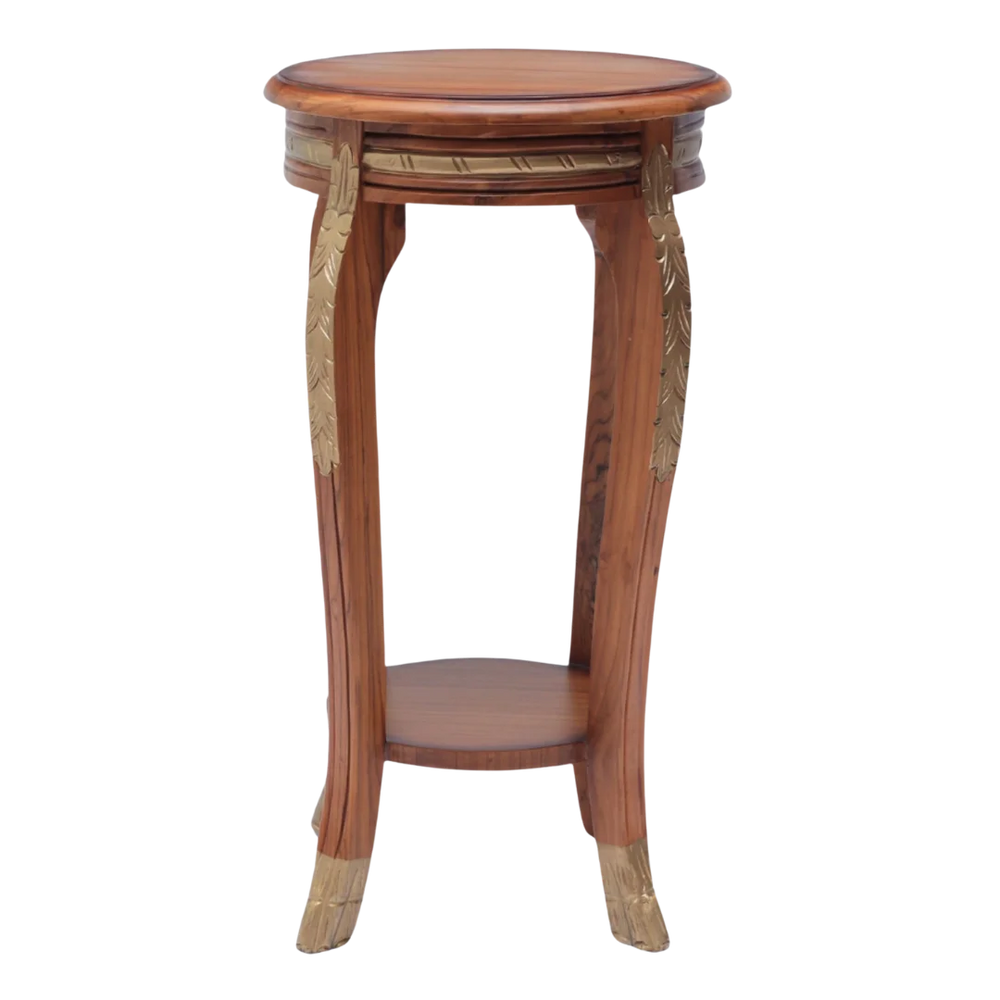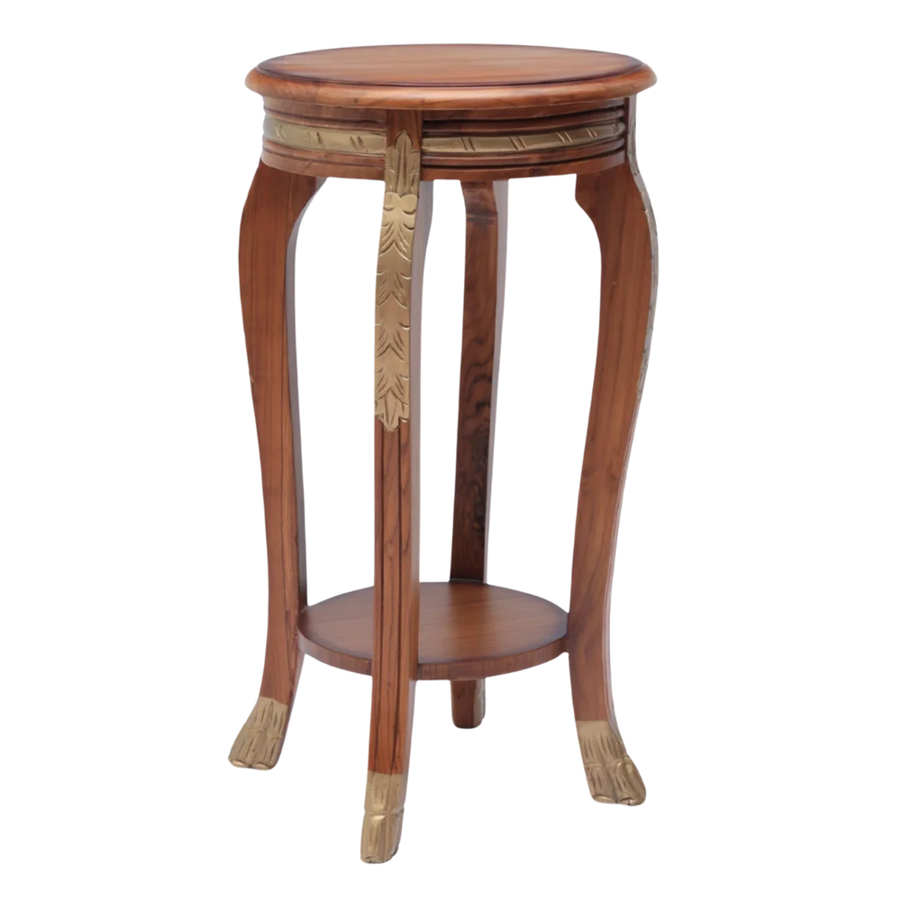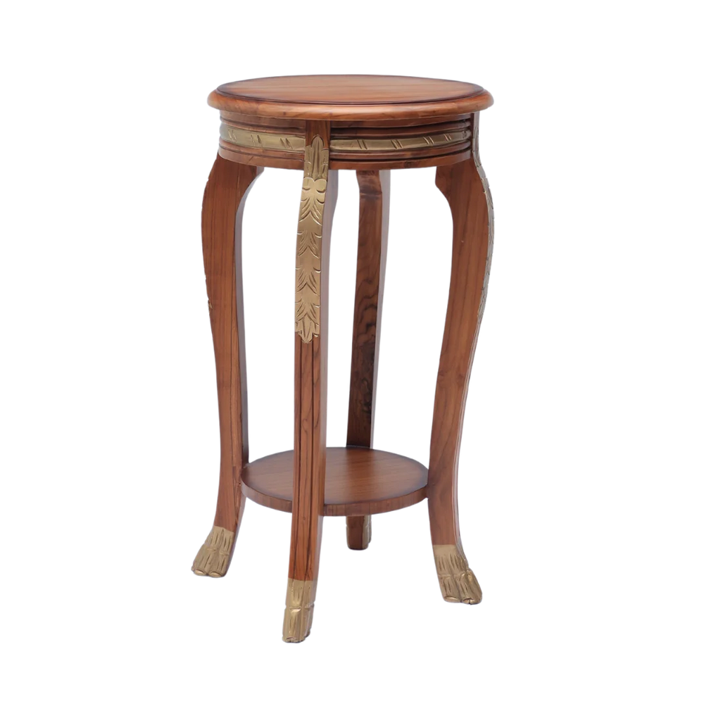 The Regal Teak Wood Planter Table is a simple and beautiful table for indoor or outdoor use. It is made to hold potted plants and add style to your space. The table has tall slim legs that give good height. There is a round shelf at the bottom for extra use. The top is perfect for placing your favorite plant or flower pot. This wooden plant stand has a mix of traditional design and a plain round top. It looks nice in corners, hallways or beside windows. It is a good choice for balconies or entry areas. The legs have small gold color carvings that add a classic touch. The table is not heavy and keeps the space looking clean and pretty. The teak color goes well with green plants and the teak finish adds beauty to modern and old-style rooms. You can use it to hold flower pots, small vases or showpieces. It is a strong and stylish choice for small spaces.