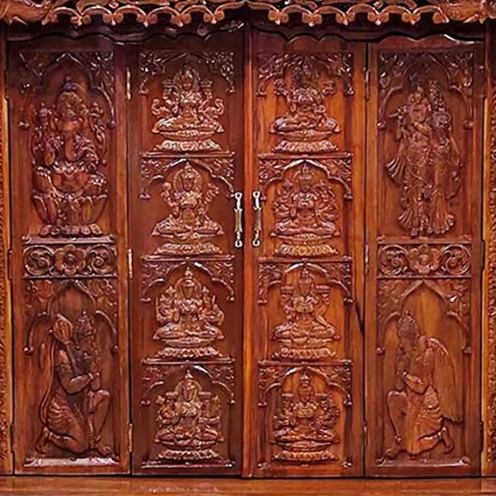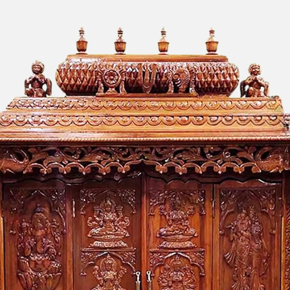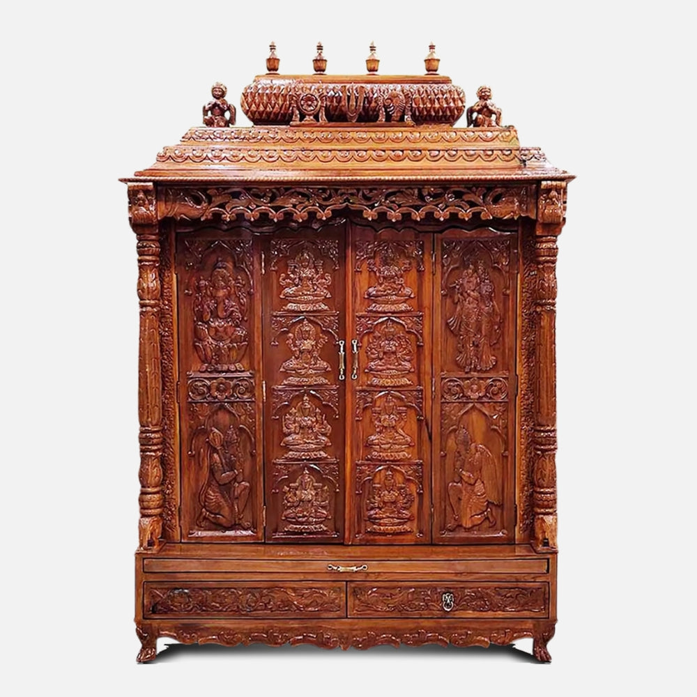 The Riddhi Teak Wood Mandir is a big and beautiful pooja mandap made from strong teakwood. It is designed to bring a divine and graceful look to your home. The front doors have detailed carvings of gods and goddesses that show the skill and patience of the craftsman. Every figure is carved neatly, giving a rich and traditional appearance. The top part has a temple-shaped roof with smooth layers and symbolic designs that look grand and spiritual. The side pillars are finely carved with clean patterns that reflect South Indian temple style. The bottom part has drawers that provide enough space to keep pooja items like incense, matchbox, and diya in one place. The teak color polish brings out the natural wood grains and gives a soft shine. Each carving and curve is shaped carefully to make the mandir strong, balanced, and elegant. This wooden mandir fills your home with peace and devotion while also adding a royal touch to your space. It is not only a place for worship but also a piece of art that enhances your home décor.