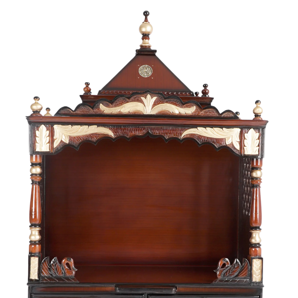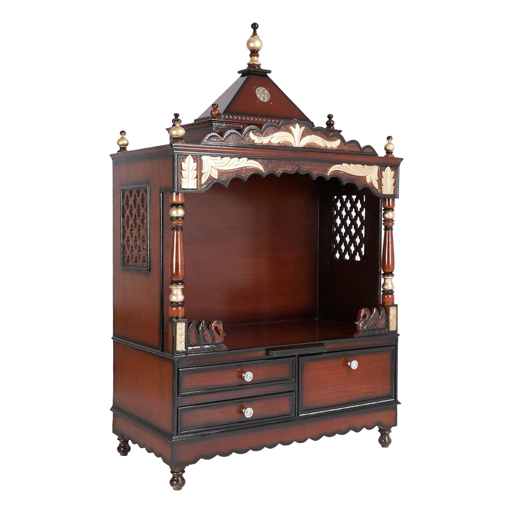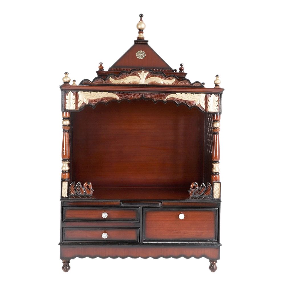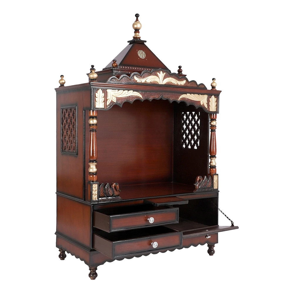There is enough space to keep all of your pooja needs in the spacious drawers located at the base of this wooden temple. You can hold your items such as incense sticks, prayer books, and small idols so that everything you need is neatly organized and easily accessible. The drawers are fitted with crystal-like knobs that look elegant and luxurious on the wooden temple, which makes this home temple both beautiful and practical. This storage option keeps your pooja space organized. It creates a beautiful and useful home temple, while also adding a touch of sophistication to your sacred space.