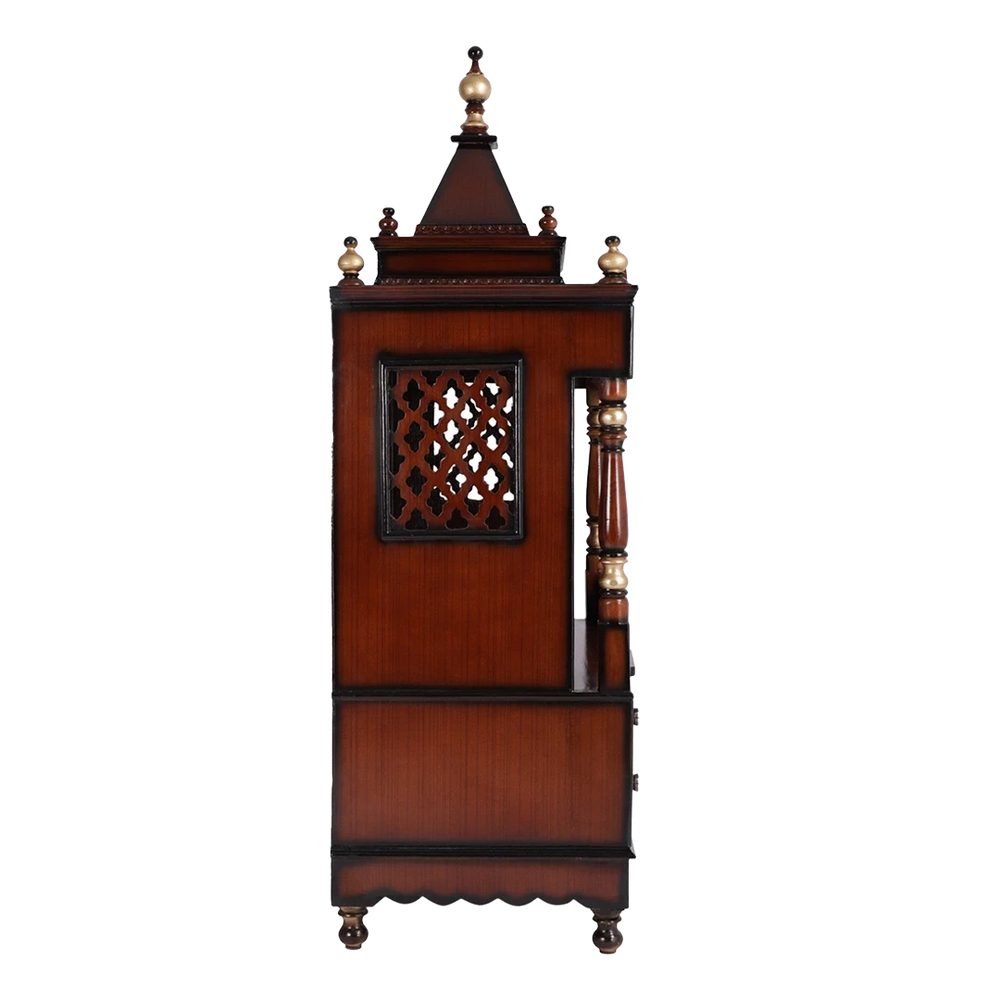 The beautifully crafted Sacred Home Pooja Mandir is a wooden temple made of premium teak wood that is designed to improve your home's visual and spiritual atmosphere. The open pooja space in this wooden temple offers a spacious and peaceful environment for your deities and pooja necessities, making it a pooja mandir for home. With its beautiful jali motifs, the side panels let light and air in and create pleasant shadows that enhance the room's spiritual ambiance. The strong pillars of the temple not only add a traditional charm but also provide strong support to this home temple. The mandir looks luxurious and elegant because of its deep brown-gold finish, which elevates it over any other piece of home décor. Moreover, the spacious drawers at the base provide useful storage for all of your pooja supplies, keeping your hallowed area neat and clean. It is easy to maintain this wooden temple, it only needs a simple wipe to maintain its beauty.