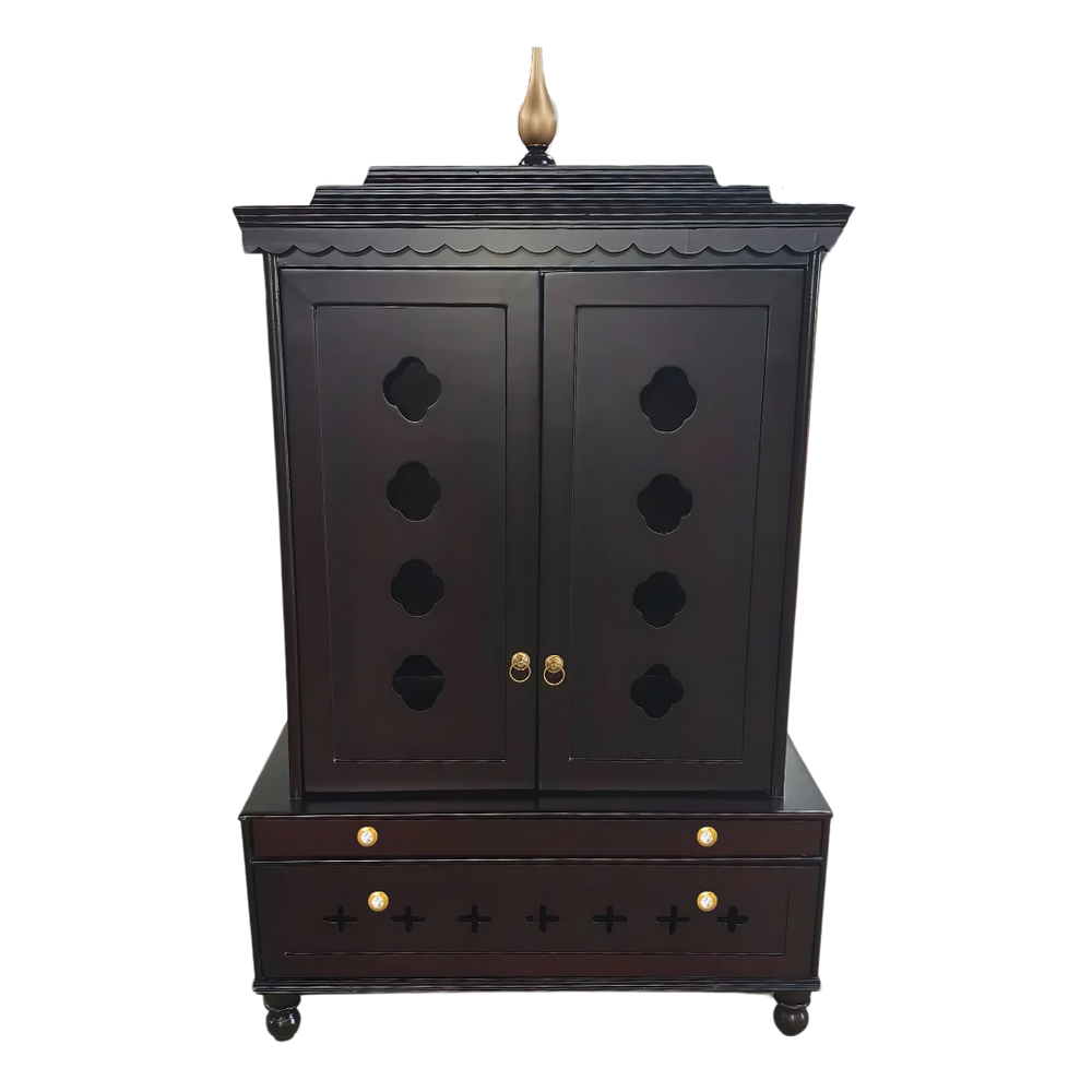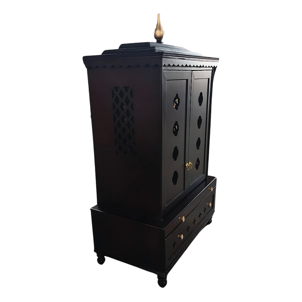 Sanraksha Teak Wood Mandir with Door in brown color is a grand pooja mandap designed for those seeking a big size wooden temple that provides both functionality and aesthetic appeal. Its clean lines and minimalist look suit modern interiors without losing traditional value. The strong base supports the structure well while offering storage for pooja accessories. The gold knobs enhance the dark brown color and add a soft shine. Decorative cut-outs on the door and drawer area add interest and highlight the detailing. With a closed structure and smooth surface, this large home temple keeps the area clean and tidy. The brown color adds depth to its overall appearance. This big mandir for home fits comfortably in large areas and allows a peaceful spiritual corner to take shape. This mandir design also supports lighting and hanging decorations that further enhance the pooja experience. Two storage drawers below offer hidden space to keep pooja-related items organized and easy to access. The structure rests on small legs for elevation and stability. From design to finish, this mandir maintains uniform color and proportion.