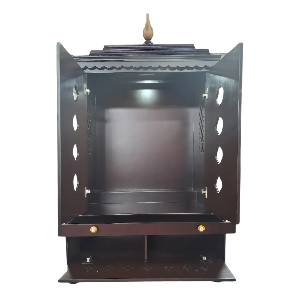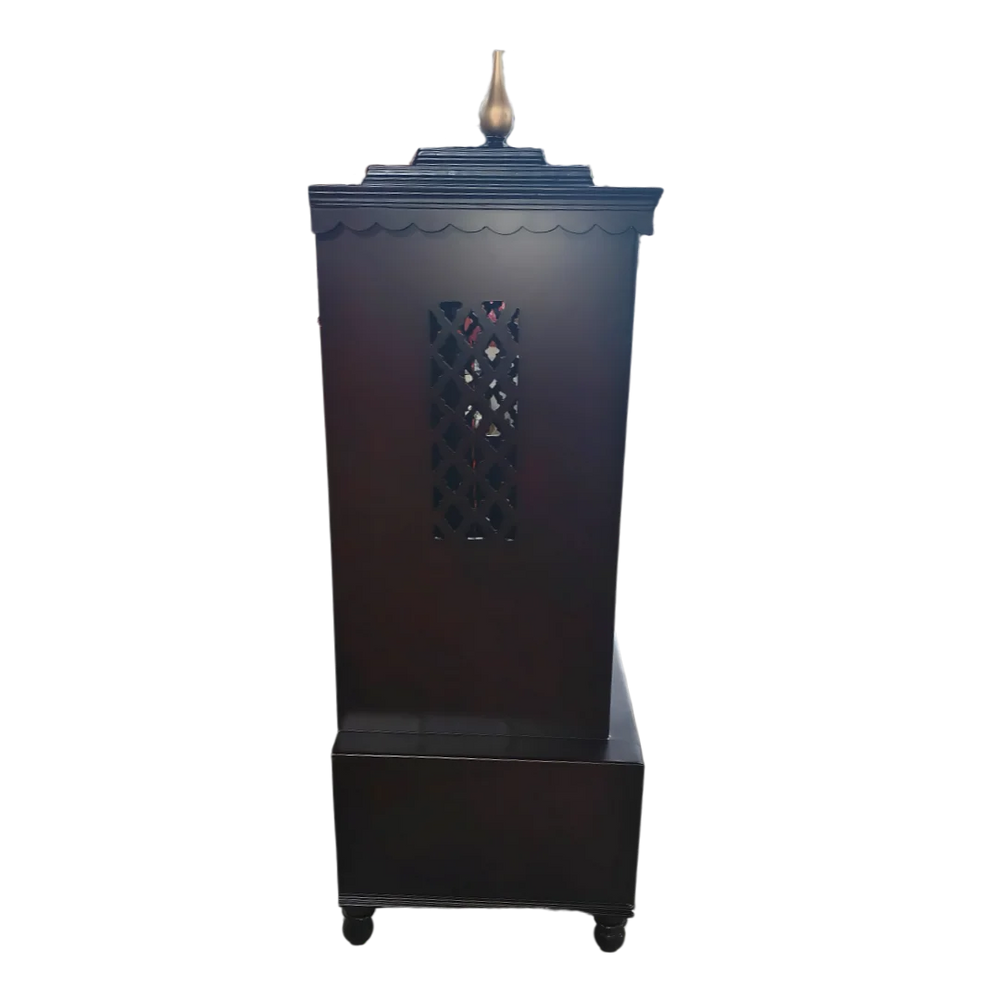 The side panels of this brown color pooja mandap have vertical jali cut-outs that allow air to circulate while also decorating the structure. These cuts are arranged in diamond and cross shapes to stay consistent with the front pattern. These jali patterns give texture and keep the walls from looking plain. The brown color on the side matches the front and adds a sense of continuity. The carving is precise and avoids sharp edges. These jali sides are part of the functional layout and add to the appearance. These cuts also reduce visual bulk and make the mandir look less heavy. The cuts also bring a flow of movement. This layout keeps the mandap aligned with modern interiors.