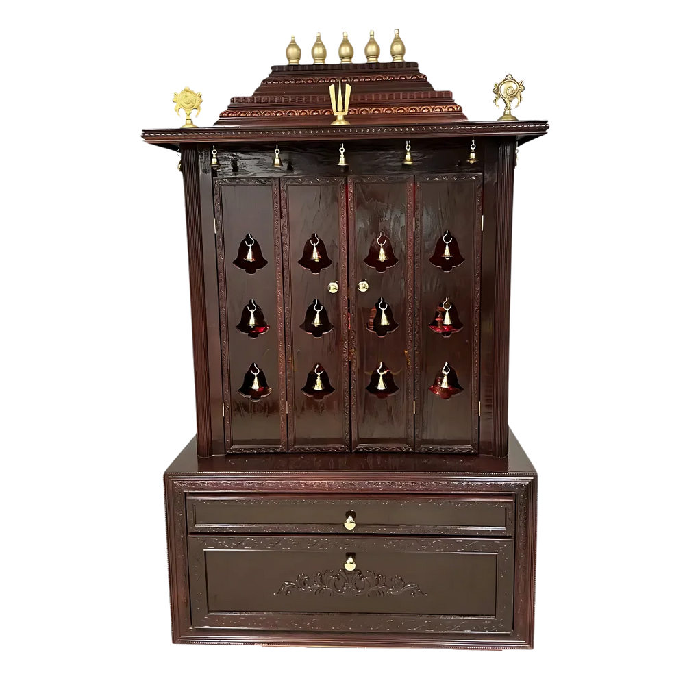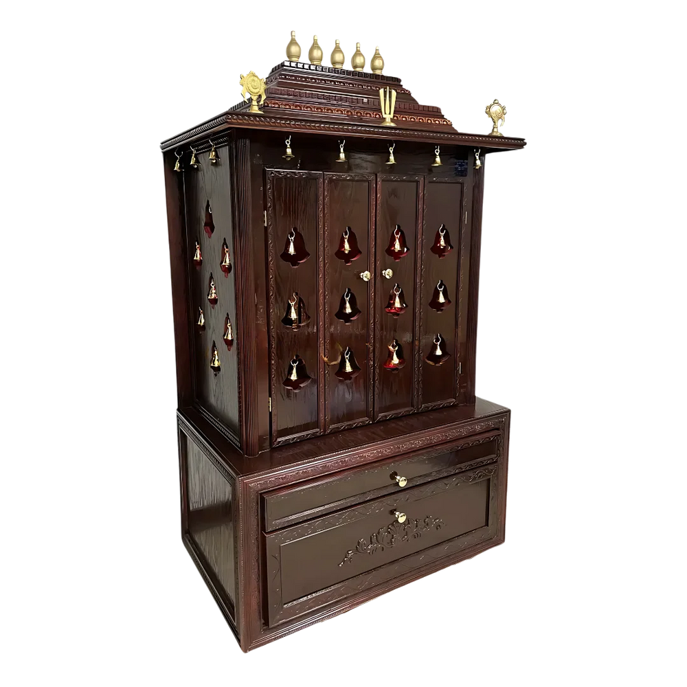 This teakwood pooja mandap has two drawers made for easy use. The top sliding tray is good for keeping matchboxes, incense sticks or small books. The big drawer below can store cloths, extra diya sets and pooja items used often. The handles are placed in a way that you can hold them easily without changing the look of the mandap. Both drawers open and close smoothly because of fitted tracks. The lower part has more space for keeping heavy items. This setup makes the mandap useful and also keeps it looking nice. It is helpful for families who do regular pooja at home.