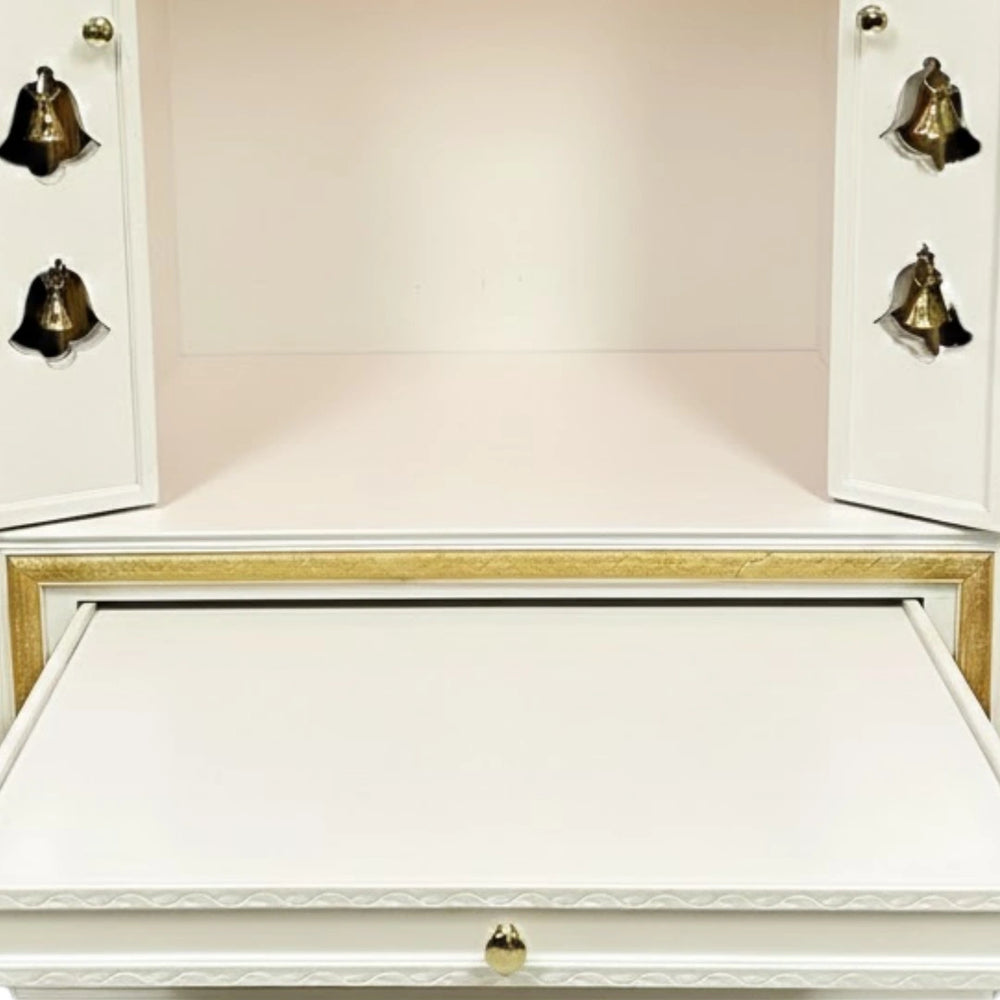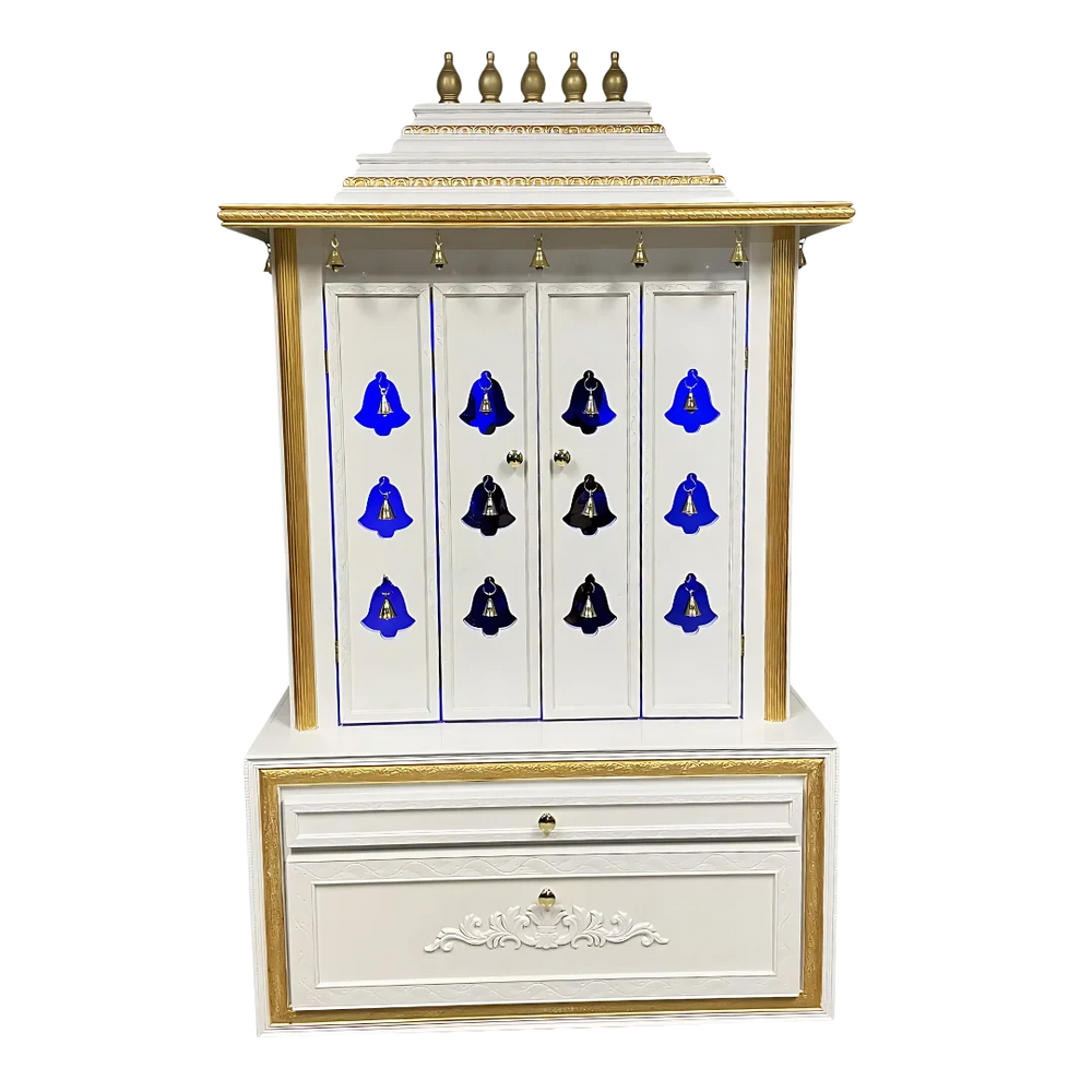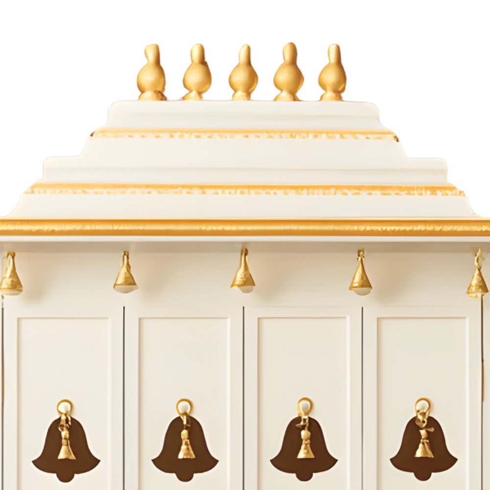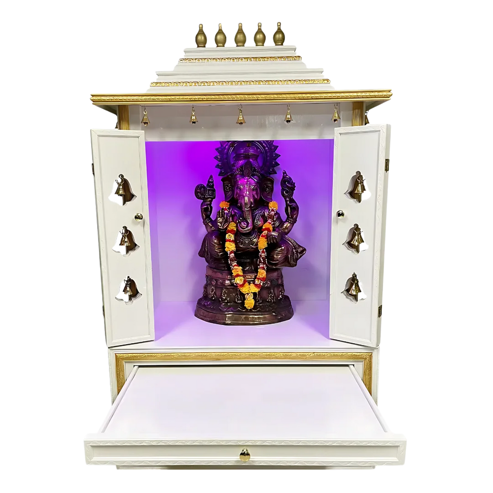 The Sanskaar Teak Wood Mandap is a luxurious and elegant pooja mandap that is made in rich white color and it is a thinking out of the box product that accentuates the spiritual atmosphere of your home. Constructed in temple-classic style, it has exquisitely carved panels, bell-shaped cut-outs and steeply ascending gopuram-like top that lends it the royal aspect.. Its broad structure offers ample space to arrange idols, lamps, and other pooja essentials with ease. This big size wooden temple is ideal for those seeking a complete sacred space in their living room or prayer area. Its spacious drawer section adds to the utility by keeping daily pooja items organized and accessible. The layered platform at the base enhances visibility and ensures idols are showcased prominently. Subtle lighting inside highlights every carving and detail, creating a devotional atmosphere. The white color blends well with traditional and modern Indian interiors. Perfectly sized for joint families or pooja rooms, this teakwood pooja mandap brings functionality, design, and spirituality together. If you're looking for a big mandir for home that stands out while serving everyday rituals, this is a reliable and divine choice.