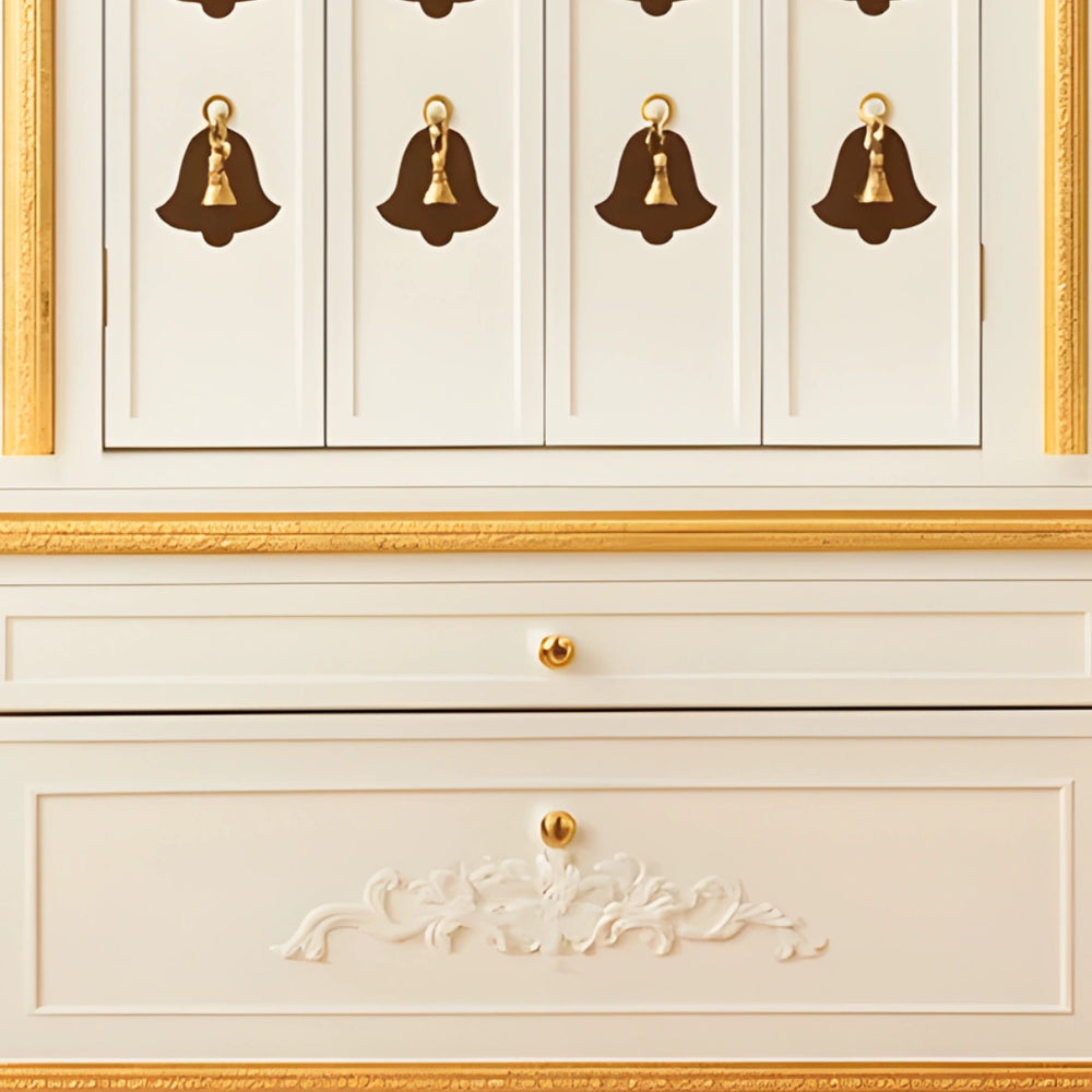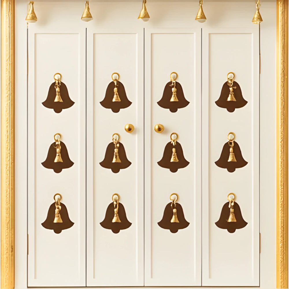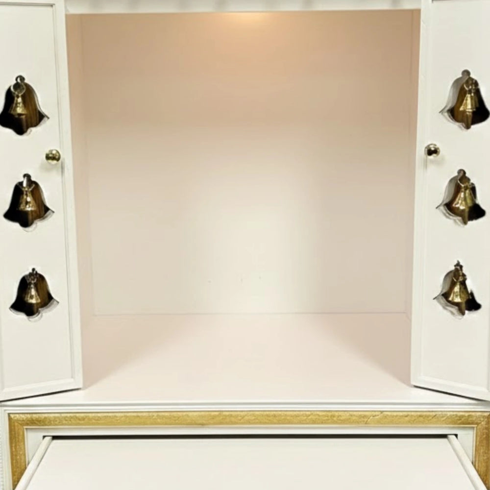 The door design has repeating bell-shaped cut-outs that look nice and also show a symbol of devotion. Small brass-like bells are added to these cut-outs and they move a little when the door is used. This adds a special charm to the mandap. The design on both doors is the same which keeps it balanced. The doors open wide so you can easily reach the pooja space. The outer part of each door has neat carved borders. This gives a strong and clear look to the front side. The door handles are placed in the right spot without breaking the design. This type of door is good for homes where pooja is done every day.