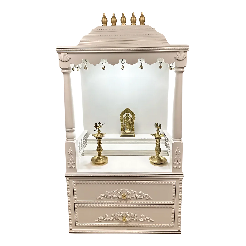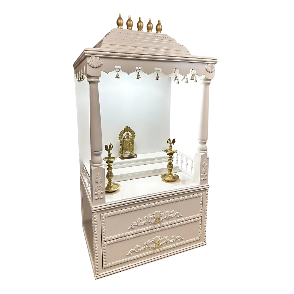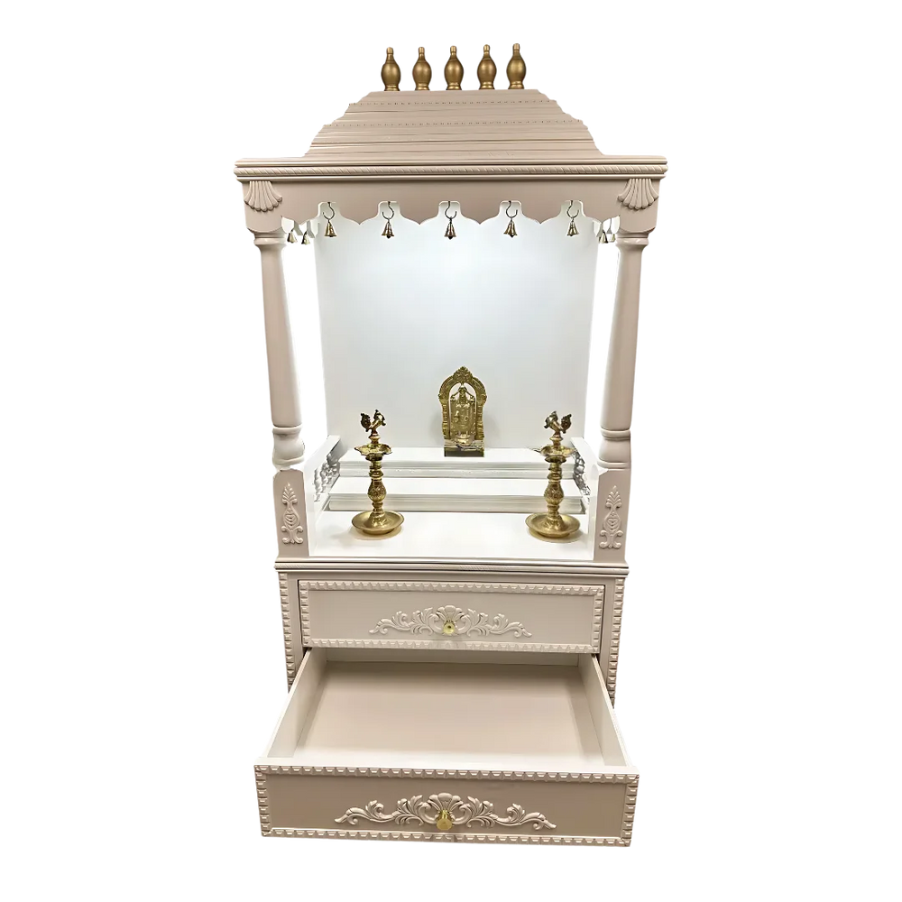 The lower part of this mandap has two deep drawers that help you keep pooja items in a clean and proper way. Each drawer has carved designs that make it look nice. The golden knobs are easy to hold and look good with the white color. The drawers have enough space to store diyas, agarbattis, and pooja books. They are placed evenly and look neat. The drawers are strong and made for daily use. This base gives both storage and beauty in one. The wide handles make it easy to open. The smooth tracks help the drawers move easily. The closed space also keeps pooja items safe and dust-free.