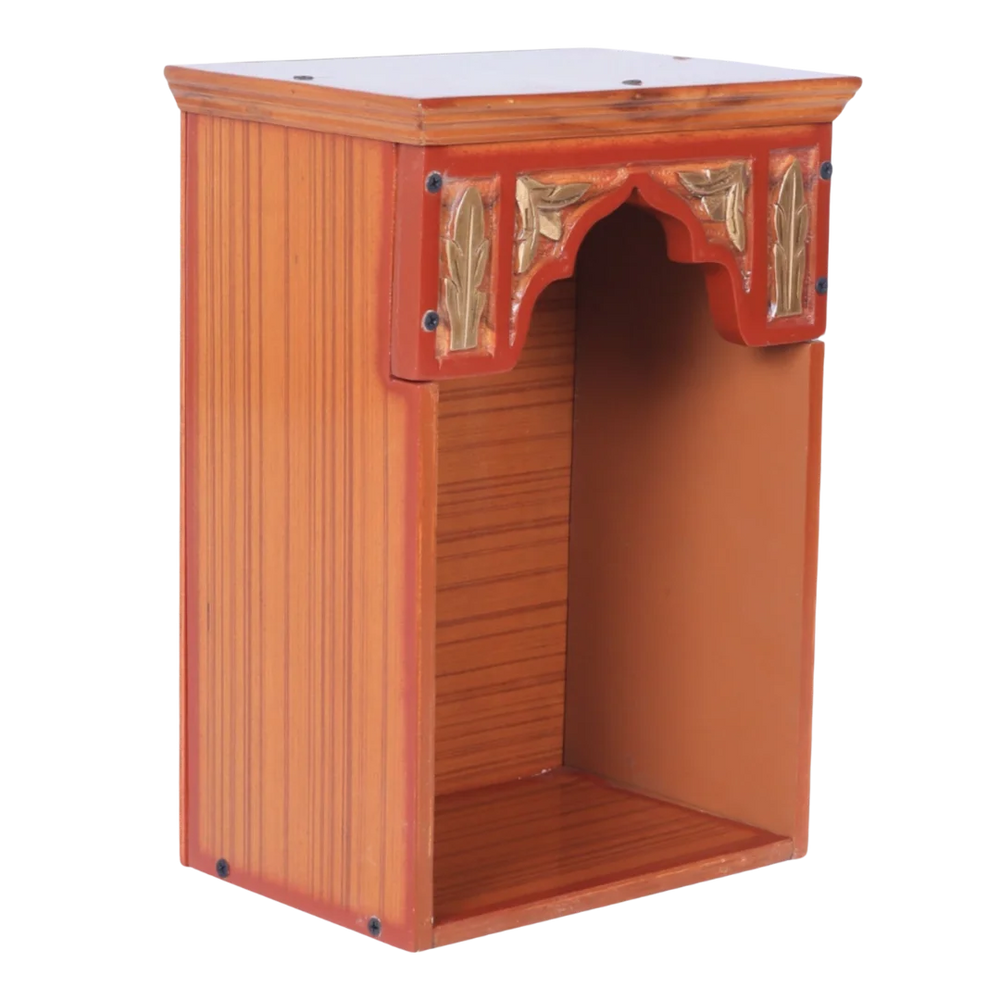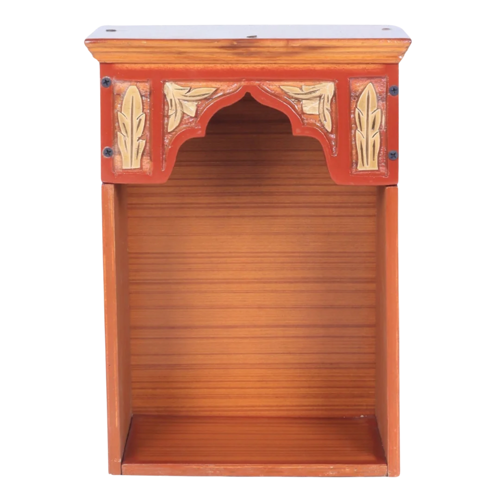 This small pooja mandir is a perfect purchase particularly you require a smaller mandir that can be accommodated within a small space. This wall pooja mandir comes with clean lines and classic arch design that will offer a committed prayer space without using any space on the floor. Whether you live in a flat or have a smaller room, this small mandir for home keeps your space organized and sacred. The soft gold touch on the carved frame adds a holy feeling and makes the mandir stand out. The teak color finish matches both light and dark wall shades and gives a calm and peaceful look. Its lightweight form helps in easy wall mounting and still keeps the structure strong. This wall hanging pooja mandir is not just useful but also adds beauty to your home temple area. The space inside is suitable for placing a small idol or diya, giving a neat and focused prayer experience. A second use of the teak color adds warmth to the look. This simple and thoughtful design brings both devotion and beauty into your home.