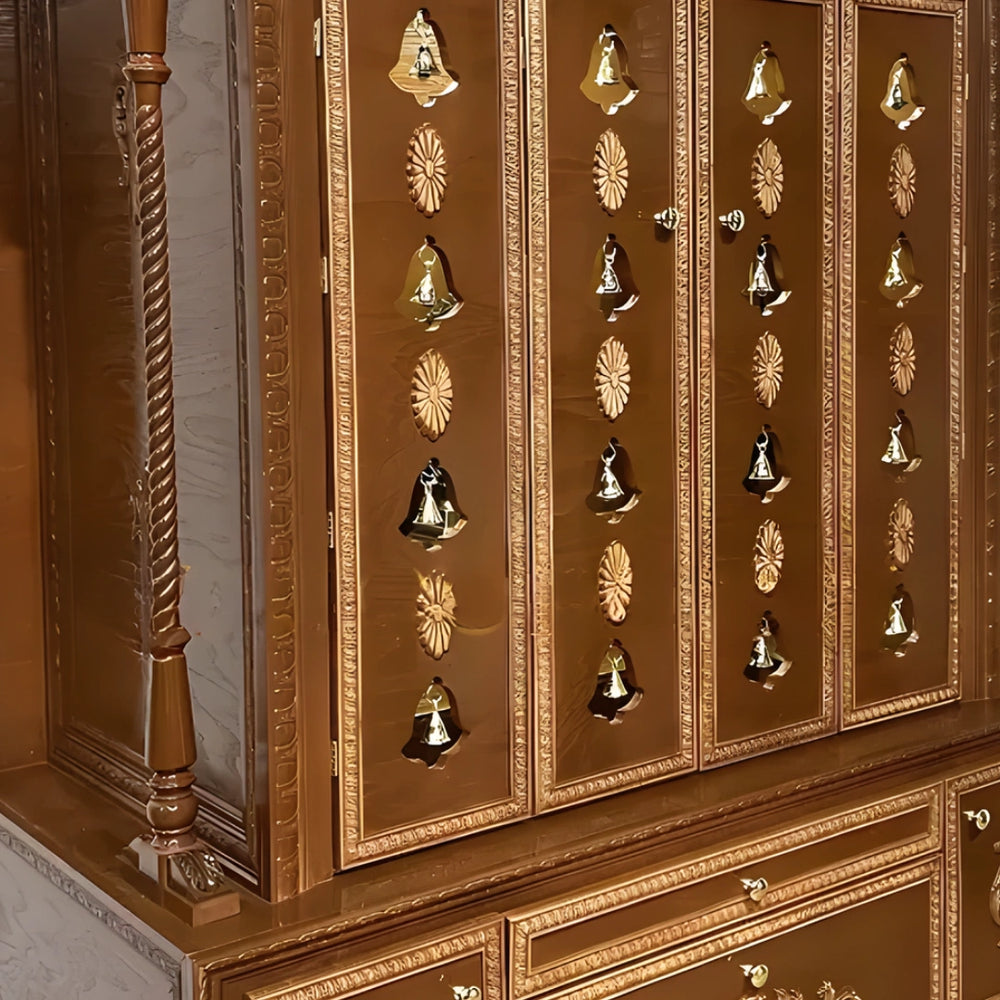 The lower part of this large size wooden temple has ample drawers and cabinets to meet the daily convenience. These storage stations are good to store pooja items like incense sticks, ghee diyas, camphor, and religious books. They are easily opened and this gives them accessibility especially at the rush pooja hours. The elegance of the mandap lives in the delicately carved designs of the top drawer-panels without diminishing utility. No matter a festival or a normal worship, all you need is within reach and the sacred area is neat and clutter- free.