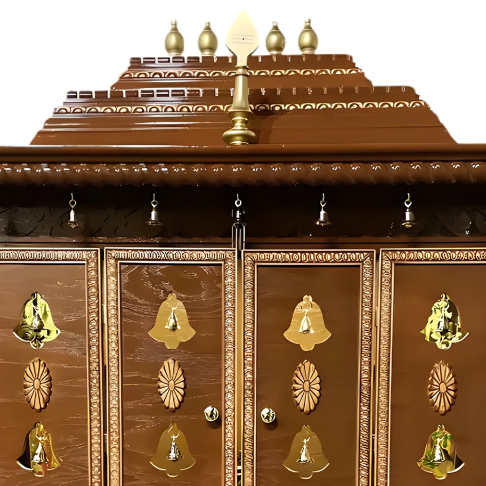 Bring home timeless devotion with the Saumitra Teak Wood Mandap Brown With Door, crafted for those who seek a meaningful and structured pooja space. This big mandir for home reflects elegance in its detailed carvings and symmetrical layout. The four-door setup with bell embellishments opens to a spacious pooja mandap that is thoughtfully arranged for sacred rituals. With layered steps and focused placement options, it supports idols, diyas, and spiritual décor in a refined manner. The elevated platform offers a clean view from all angles, whether seated or standing. The surface polish highlights the richness of the brown color, giving a divine glow under warm lighting. The brown color blends beautifully with both traditional and modern interiors. Ideal for those looking for a big size wooden temple, this piece transforms any room into a serene devotional zone. As a teakwood pooja mandap, it offers durability and lasting charm, perfectly aligning with spiritual energy and daily practices. Every detail, from structure to finish, contributes to a prayerful experience that is visually balanced and spiritually uplifting.