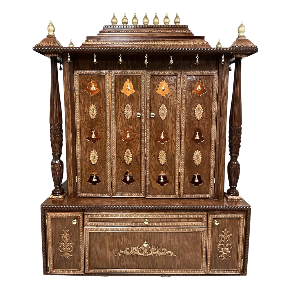 The doors of this big size wooden temple feature multiple bell-shaped and flower carvings that look rich and festive. They open fully to provide wide access to the mandap interior. These tall doors help maintain privacy while still letting light inside. The carvings on both sides give a layered, artistic touch. The doors are strong and secure with smooth swing movement. Their positioning also helps in reducing dust inside the mandap. The handles are placed at a comfortable height and match the golden detailing. These doors add depth, beauty, and structure to the overall mandap design.