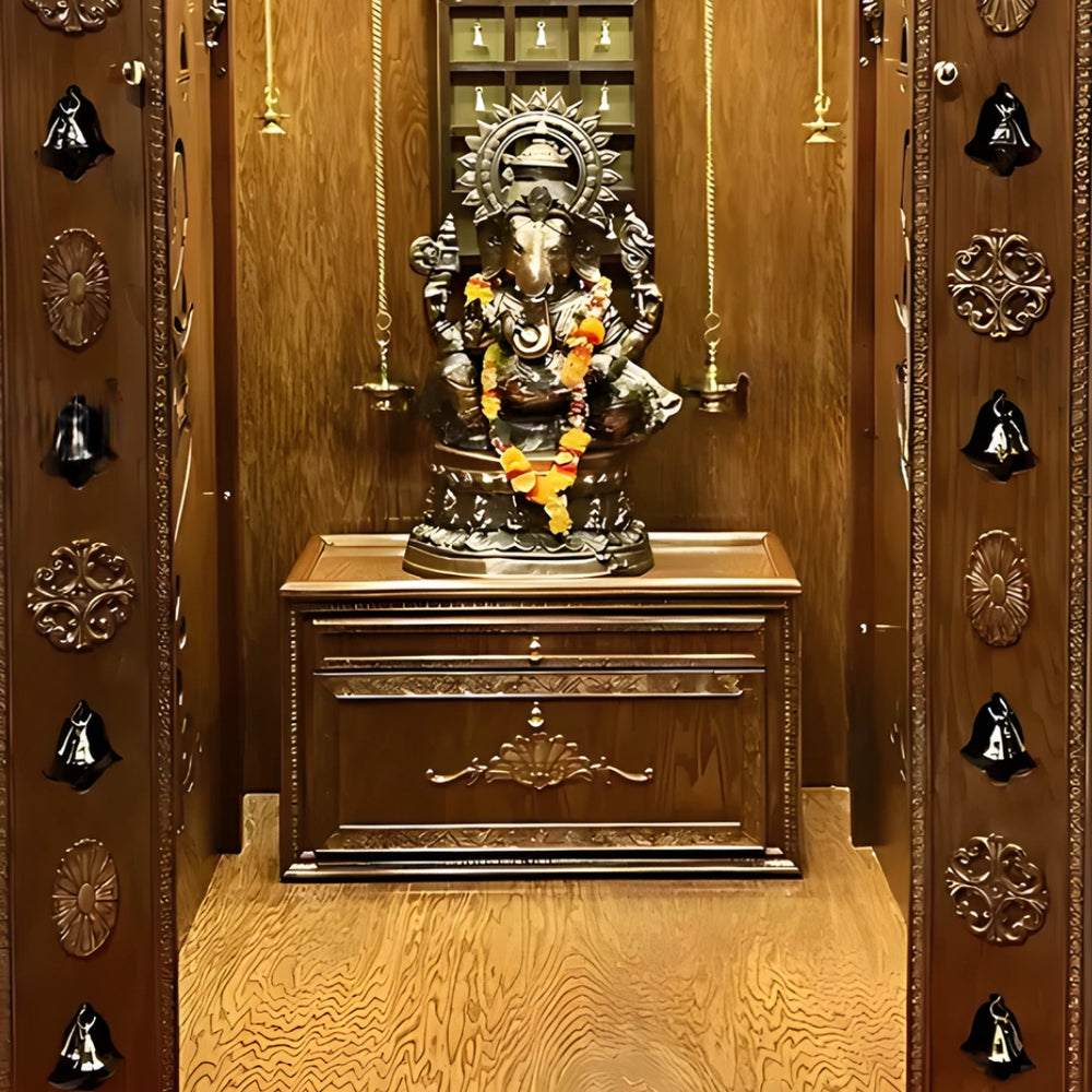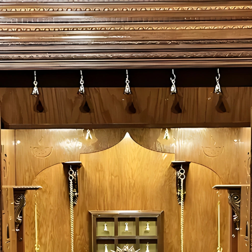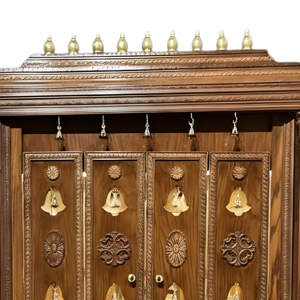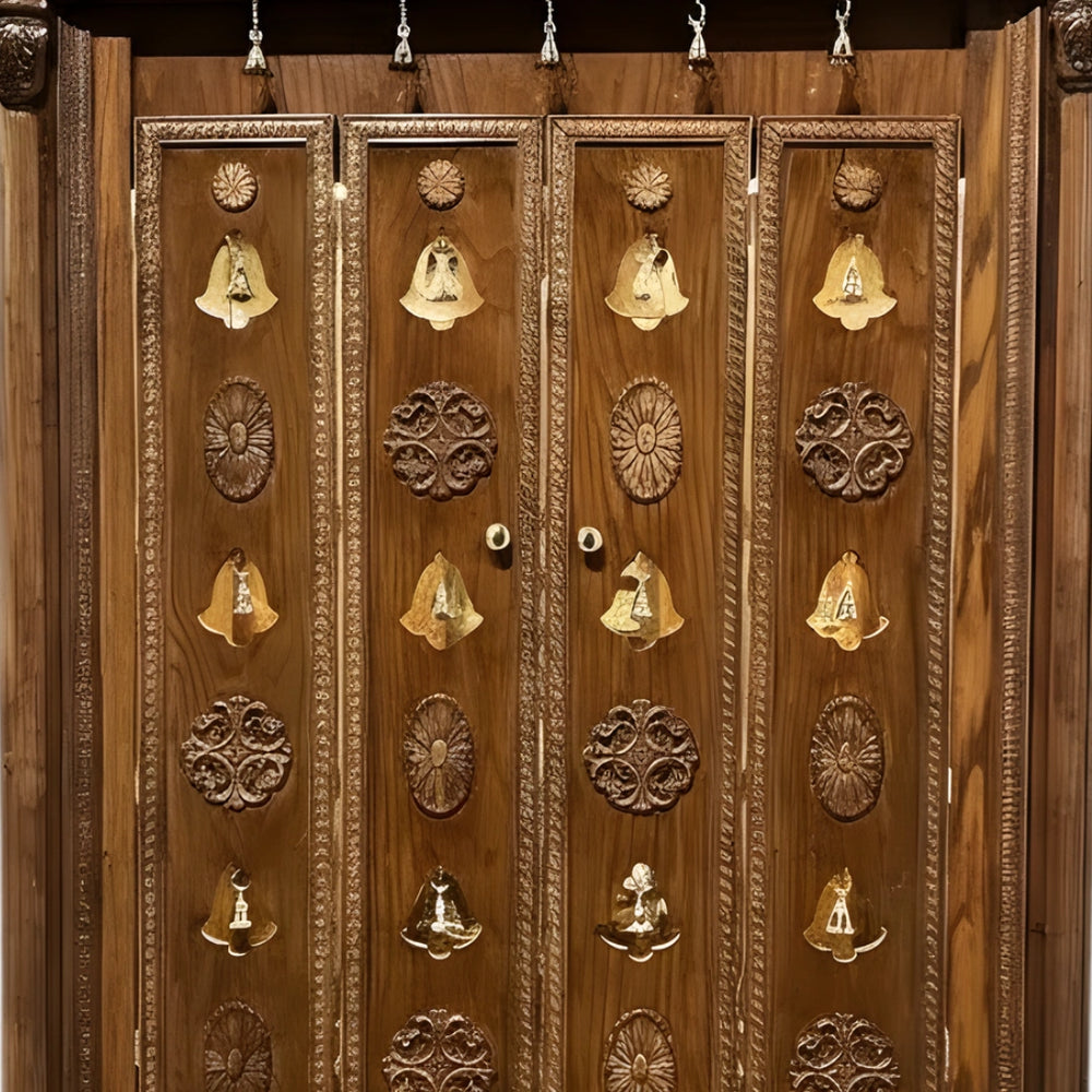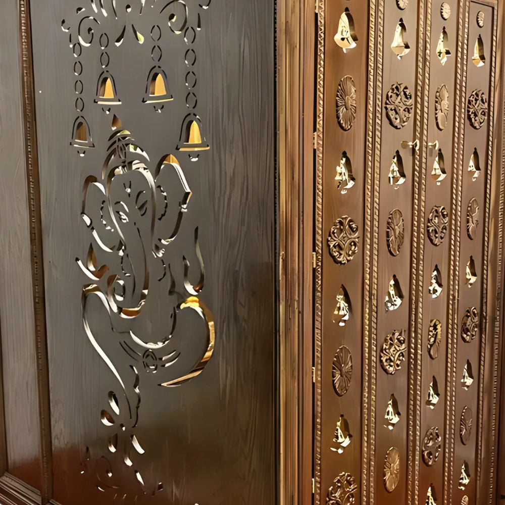 The mandap has four full height doors with duplication of carvings of bells and flowers that give the entry of the mandap a grand look. These doors slide easily and they provide total access to the pooja. Gold coloured handles are adjusted at a comfortable height. The carvings give it a temple-like design and enhance the visual style. The spacing between patterns keeps it easy to clean. The brown color brings out the depth of these patterns. These doors maintain a private and sacred space when closed and look beautiful when opened. They are strong, steady, and made for everyday use.