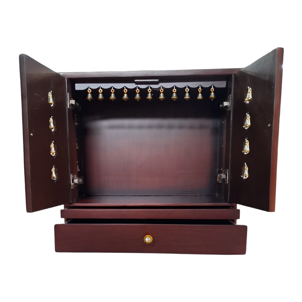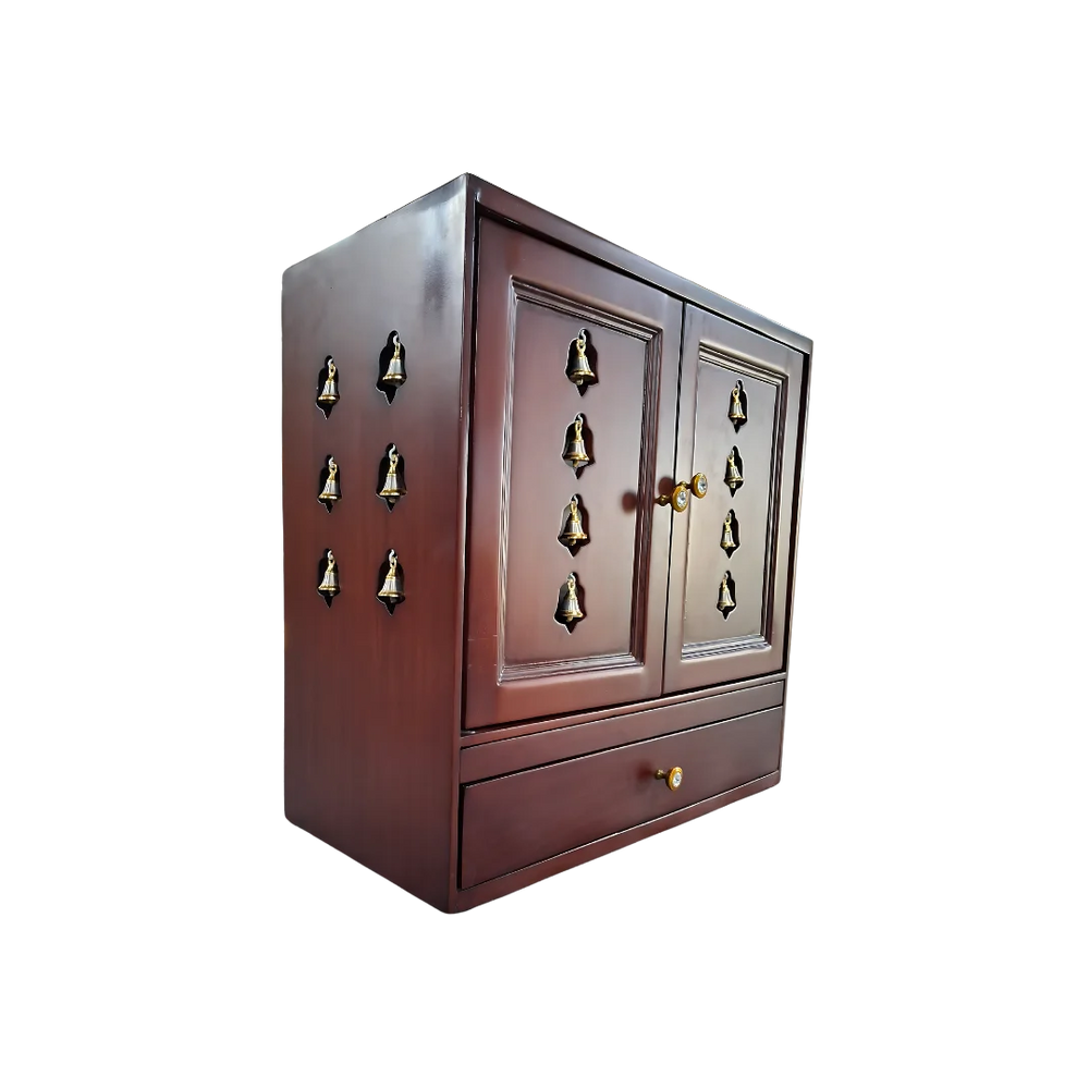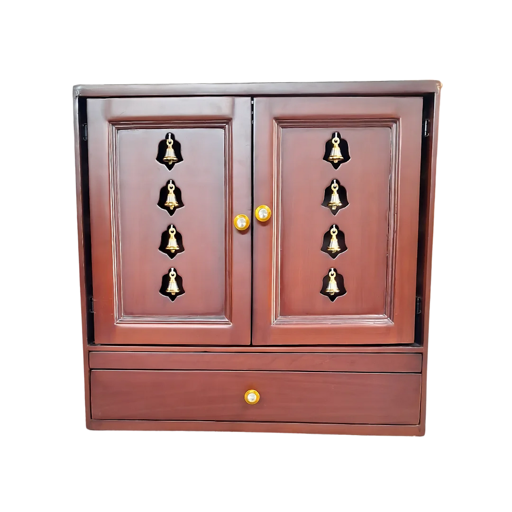 The Sharvakriti Teak Wood Mandir is a small pooja mandir made for homes with less space. It can be fixed on the wall and is built to give a peaceful prayer place without using floor space. The bells on the doors and sides add a spiritual feeling even when the doors are closed. Inside, the space is plain and clean where you can place idols or photos. It has a drawer that helps you keep daily pooja items safely. The golden knobs and neat design give it a nice look. The brown color makes it look rich and matches all kinds of home interiors. This small mandir is perfect for flats and small rooms. With a smooth finish and simple shape, it keeps your prayer space calm and useful without taking much room. The arch design on top gives it a temple-like feel. The strong frame makes sure it stays firm even with daily use.