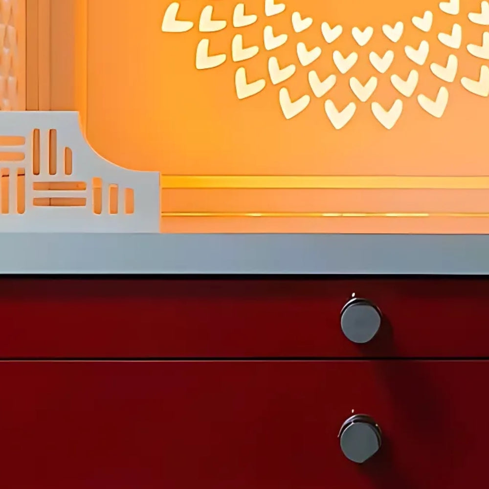 The primary design of this pooja mandir is the Om cutout on the back panel. It glows gently when the light is passed through and it offers a serene appearance to the prayer area. The pattern has even spacing and neat lines that add depth to the temple. The light highlights the fine design and creates a calm atmosphere during prayers. The white surface matches the glow perfectly and keeps the mandir looking simple and elegant. This design adds both beauty and devotion to the pooja space. The Om design adds a sacred focus point for daily worship. It brings light and devotion together in a modern form. This element makes the mandir look bright and full of life every time it is lit.