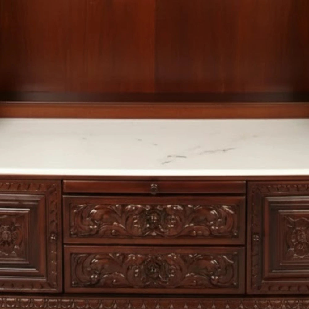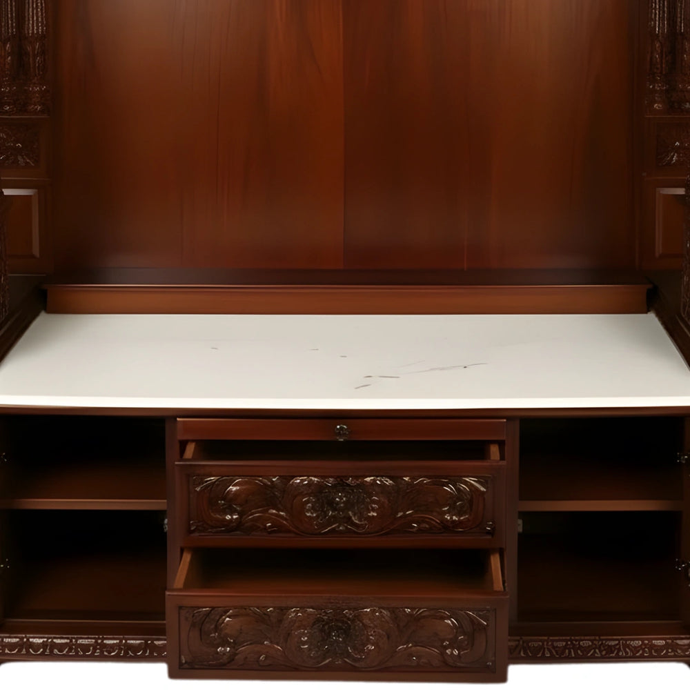 The Shrivatsa Mandap in brown color is a traditional big pooja mandir that reflects spiritual grandeur in its design. This pooja mandap features carved motifs across the frame, pillars, and the top crown, offering an elegant look that defines devotion. The layout is ideal for those looking for a large pooja mandir for home with a deep prayer space and a white marble base that brightens the overall setup. Every corner has been carefully designed to offer visual richness and religious purpose. The brown color finish highlights the depth of the carvings and gives a rich backdrop to idols. Its functional drawers offer storage space for prayer items while maintaining the flow of the aesthetic. Whether you are placing this in your prayer room or in a living space, this big home temple commands presence with its grand size and symmetry. This pooja mandap is perfect for daily worship and festive decor, allowing enough room for ritual arrangements. This structure easily becomes the central spiritual element of any space and is designed to reflect the deep cultural traditions of Indian homes.