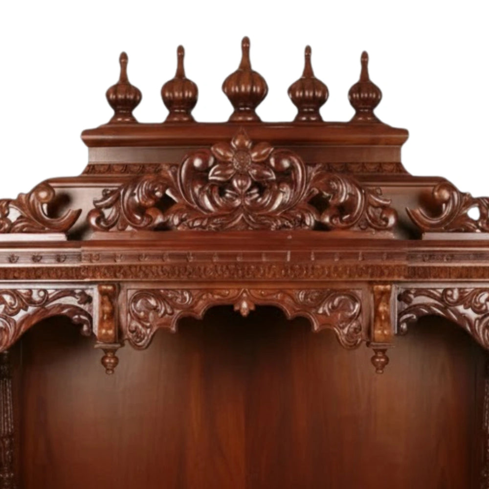 The top crown of this big pooja mandir is designed with floral and kalash patterns that draw attention upward. This pooja mandap's upper section adds balance and creates vertical harmony for large pooja mandir for home setups. The detailing is deep and neat, allowing the upper section to stand out while still blending with the overall frame. It also supports visual elevation for idols placed below. Its curved patterns give it an artistic identity. The brown color finish deepens the cuts and shadows. This crown helps make this big home temple the focus of the room. The crown structure brings height and temple-inspired dimension to the setup.
