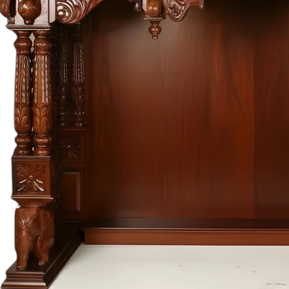 The vertical supports on either side of this pooja mandap are shaped like traditional carved temple pillars. Their rounded base and animal-shaped bottom give this large pooja mandir for home a rooted look. These sculpted forms echo South Indian architecture and bring a sacred tone. Their surface is hand-detailed, offering both structure and beauty. The carvings create rhythm across the height of the mandap. Their solid placement gives strong support to the upper frame. Finished in brown color, they help merge strength with elegance. The pillar accents help frame the central idol space with grace.