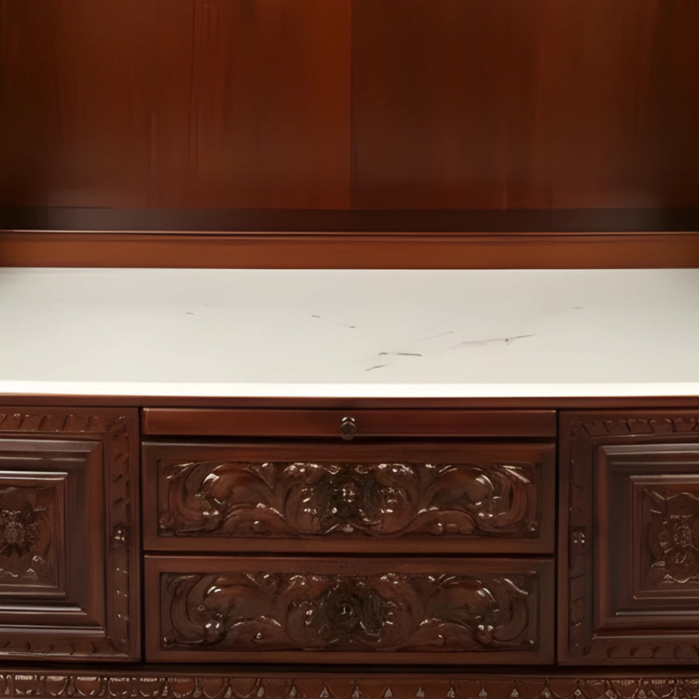 This large pooja mandir for home features a white platform base that provides contrast and a calm appearance. The base stands out clearly against the dark brown color of the frame. It acts as a neutral background for placing idols and ritual items. The surface is easy to clean and maintain during daily use. The flat surface is broad enough for setting up large arrangements. The white tone gives a premium feel and supports the classic format of a big pooja mandir. It completes the look of a devotional and functional prayer area. The contrast base also helps highlight the idol space better.