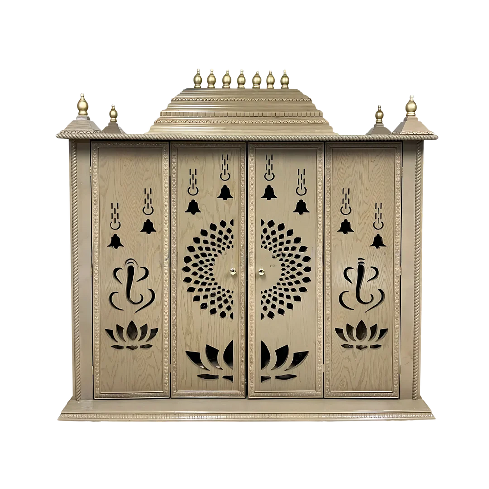 Shriyantra Teak Wood Mandap With Door in Cream Color is a finely crafted big size wooden temple designed for peaceful pooja experiences at home. The front of this pooja mandap features bold laser-cut patterns with traditional lotus and bell motifs that offer a temple-like appearance. The temple opens fully with strong four-door panels giving wide access to the inner pooja space. Inside, there are neat levels that help place idols, lamps, and pooja items in an organized way. The design supports both visual beauty and daily use. The step platform is carved properly to maintain balance during worship. The pillars on the side add structure and enhance the visual appeal. The base has a smooth layout with hidden storage options for pooja items. The clean background supports a clear idol view. The top part is shaped like a dome and is balanced with side extensions. The cream color gives a soft and rich look which blends well with modern home settings. The carvings and designs stand out more in this cream color and bring focus to the detailed art. It is a complete unit for a divine experience.