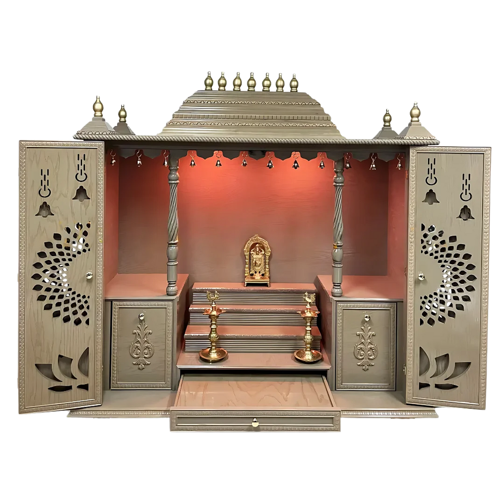 The front doors of this mandap feature laser-cut patterns of lotus and bell shapes. These designs give the feel of a temple entrance and maintain privacy when closed. The pattern is neat and adds a modern yet spiritual touch. It gives a half-view of the inner space while keeping the pooja place protected. The handles are smooth and placed in the center for balanced usage. Each door opens smoothly without noise or friction. These doors create a strong front view and hold the frame in place. The uniform pattern makes cleaning easy and keeps the design looking sharp. It makes the mandap eye-catching from all angles.