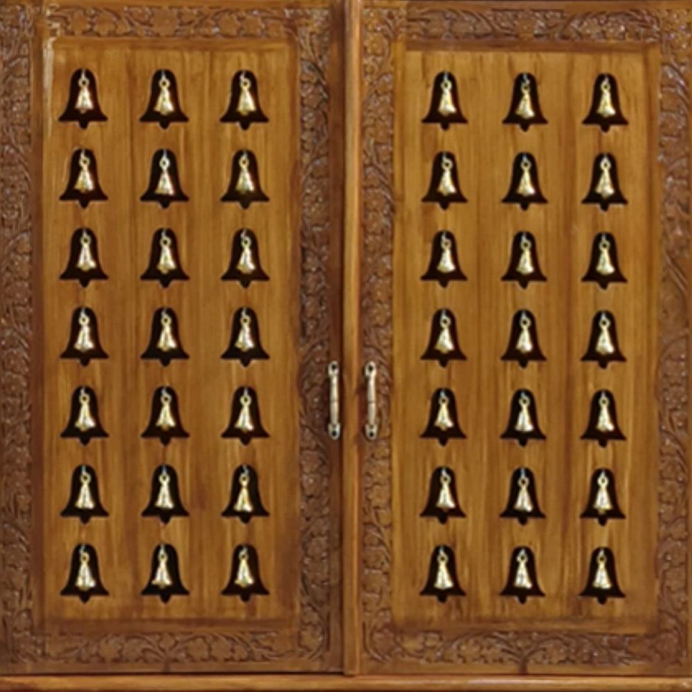 The teak color surface makes the carvings have a natural shine and gives depth in each and every handmade detail. All carvings of mandir add rhythmic quality to the design that makes the design sacred. The frame around the doors is carved to give a complement of the bells, and this makes the front look balanced. The carvings have depth due to the polish that emphasizes the teak color finish. The handles are cleanly aligned, which allows them to operate smoothly and at the same time have a graceful appearance. The pattern of the bells represents purity and devotion that makes this large wooden temple visually unique. The hand-carved outlines around the borders add refinement to the overall surface. The structure captures light evenly and gives the doors a graceful appearance.