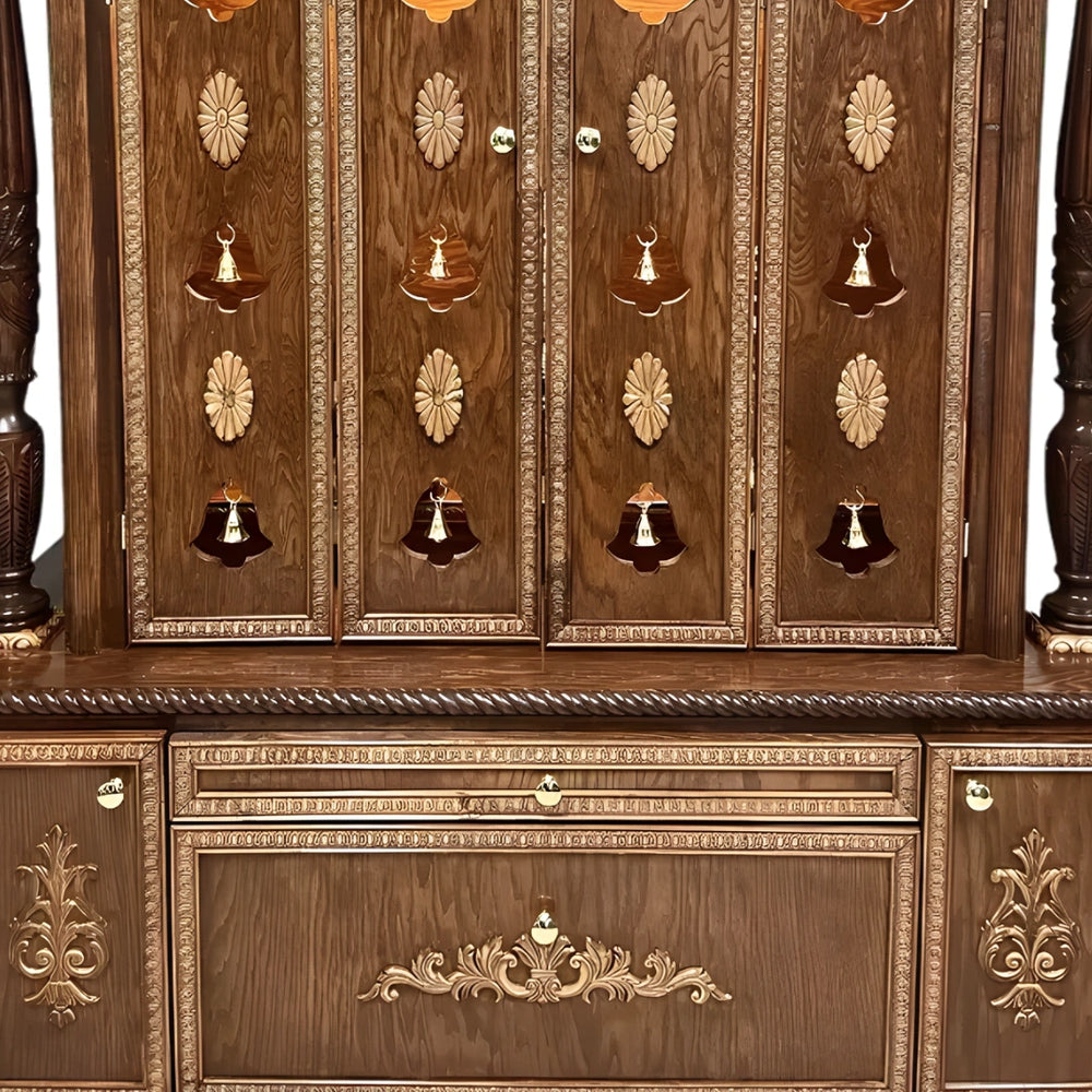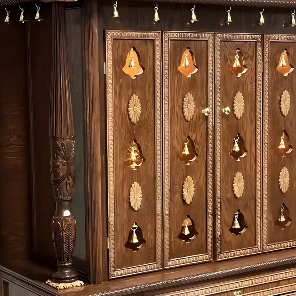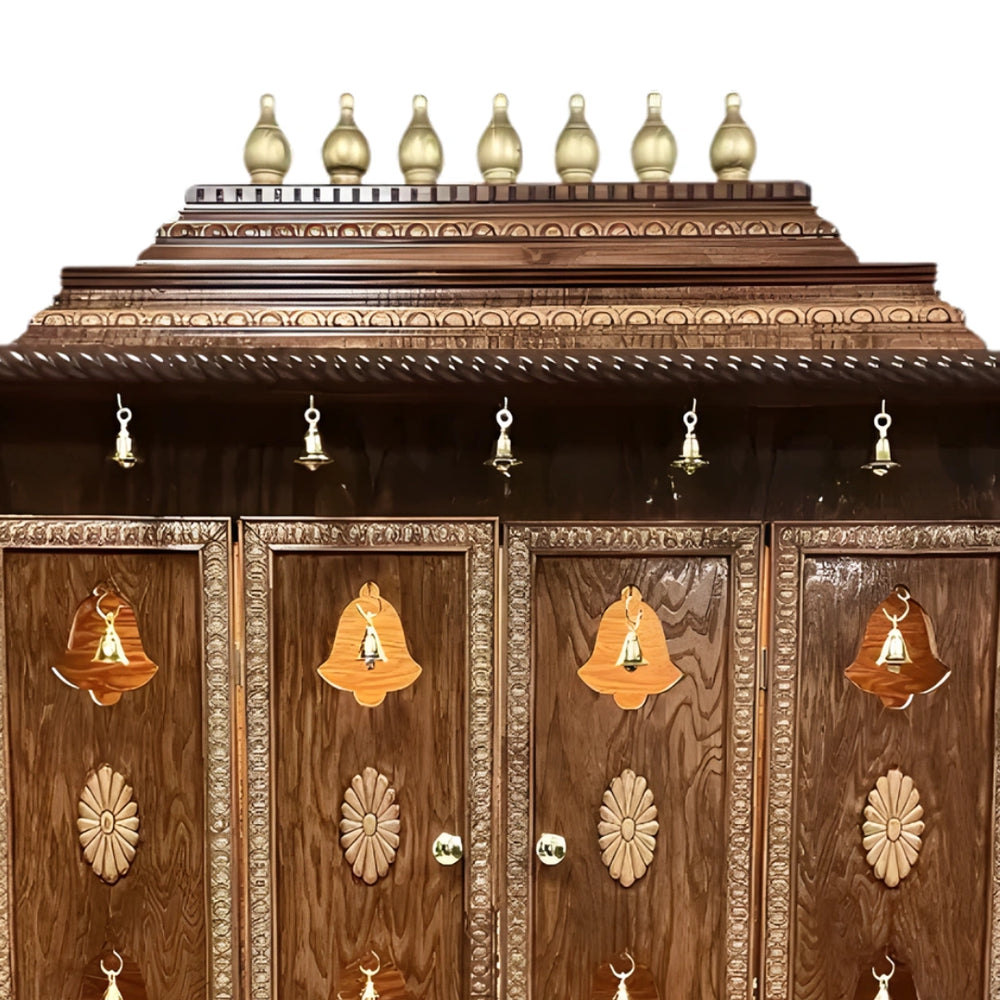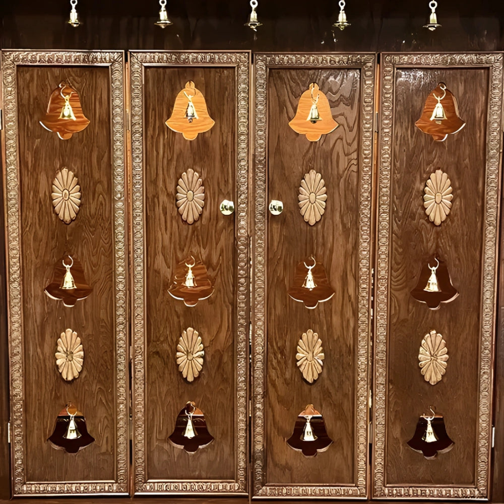The doors of this big size wooden temple feature multiple bell-shaped and flower carvings that look rich and festive. They open fully to provide wide access to the mandap interior. These tall doors help maintain privacy while still letting light inside. The carvings on both sides give a layered, artistic touch. The doors are strong and secure with smooth swing movement. Their positioning also helps in reducing dust inside the mandap. The handles are placed at a comfortable height and match the golden detailing. These doors add depth, beauty, and structure to the overall mandap design.