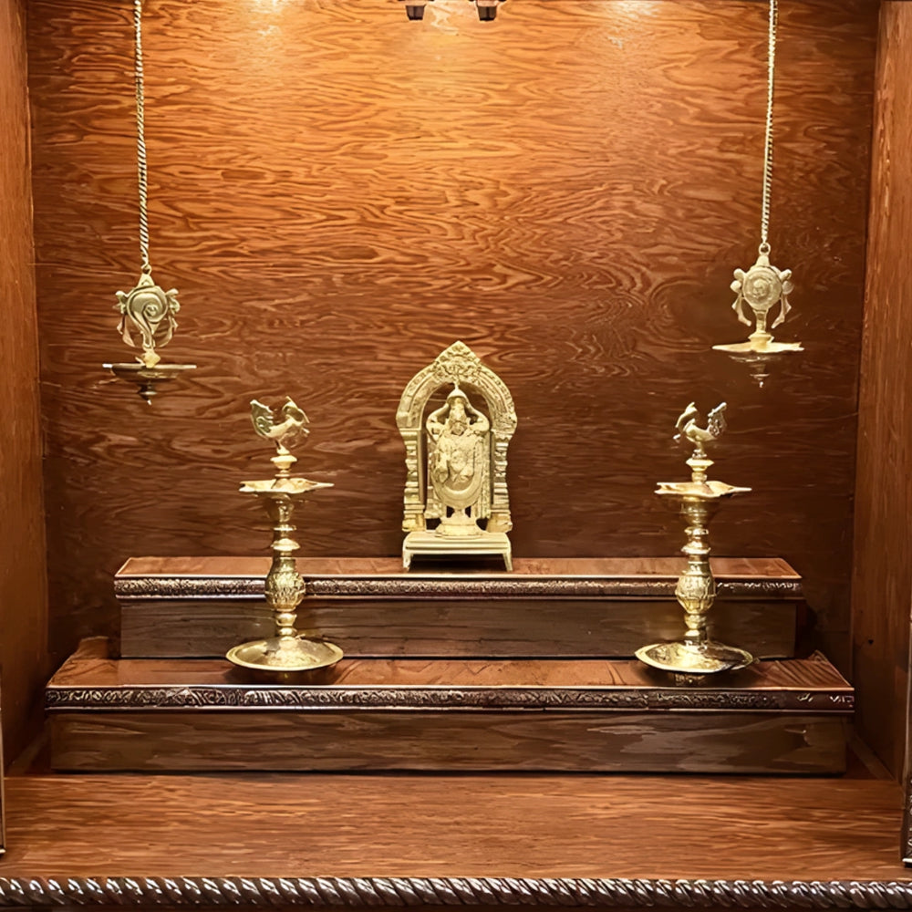 This mandap has a step-style platform that helps you place idols and pooja items in a proper way. The base is wide and flat which keeps everything neat. The raised back part makes the main idol easy to see. You can place deepams and thalis without making the area look full. The space looks open and helps you stay focused during prayer. This platform works well for both single and many idols. It also gives a clear prayer direction. The caramel brown color looks nice in the background and keeps the focus on the idols. It helps create a clean and peaceful setup.