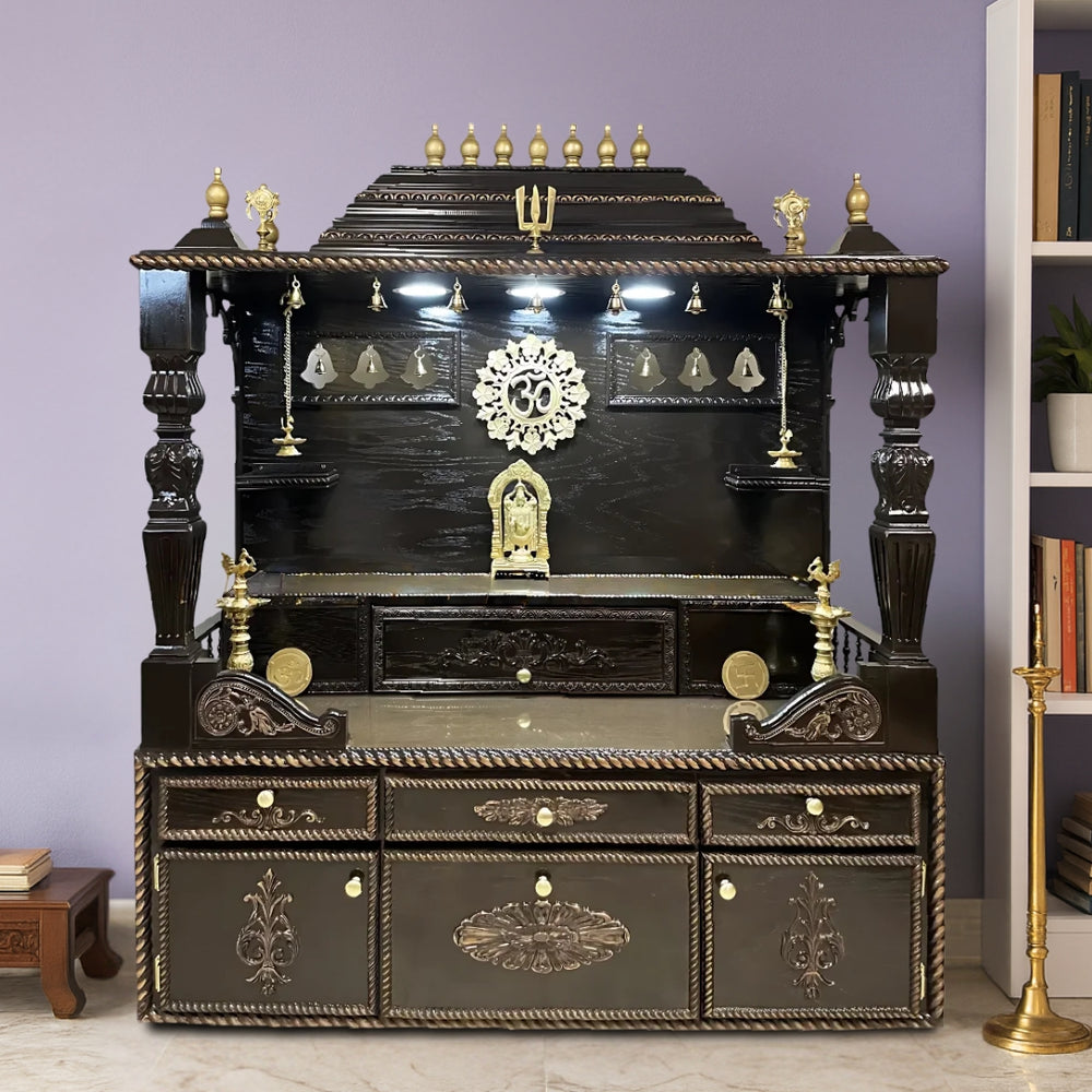 Equipped with a range of storage solutions, this large pooja mandir includes drawers, pull-outs, and hinged cabinets for optimal organization. Carved details and antique-style knobs maintain harmony with the overall design. The drawers are easily accessible as they have a smooth gliding motion, even in the middle of active rituals. Things like incense, prayer book, diya oil, and sacred garments can be stored without being disorganized. The compartments are designed intelligently to be used in a reasonable proportion. It is also designed to make a distinction between sacred and common objects. The whole base gives the effect of a unity in choco brown finish. It is ideal when you are in search of a large size home temple that keeps the things neat under cover.