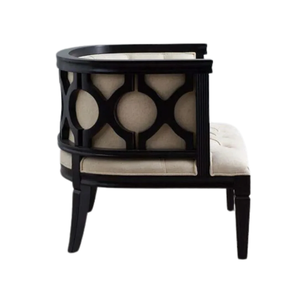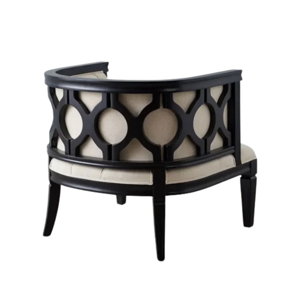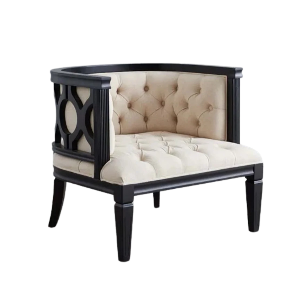 The Sienna Curved Lounge Chair brings style and comfort to your home with its special design. This wooden lounge chair has a bold semi-circular shape with neat cut-outs that give it a modern look. The deep-button tufted cushion in soft beige color makes the seat plush and very comfortable. The chair is finished in a rich black color which helps it fit well with both modern and classic rooms. The curved backrest gives good support which makes it a great choice for living room corners, bedrooms or study areas. The mix of strong build and open design makes the room feel fresh and elegant. The strong frame and thick cushions make this chair perfect for daily use and special events. The black and beige colors together give a timeless and stylish look to any room. The smart mix of curves, button design and open patterns gives the Sienna Lounge Chair a special look that easily becomes the main highlight of any beautiful living room.