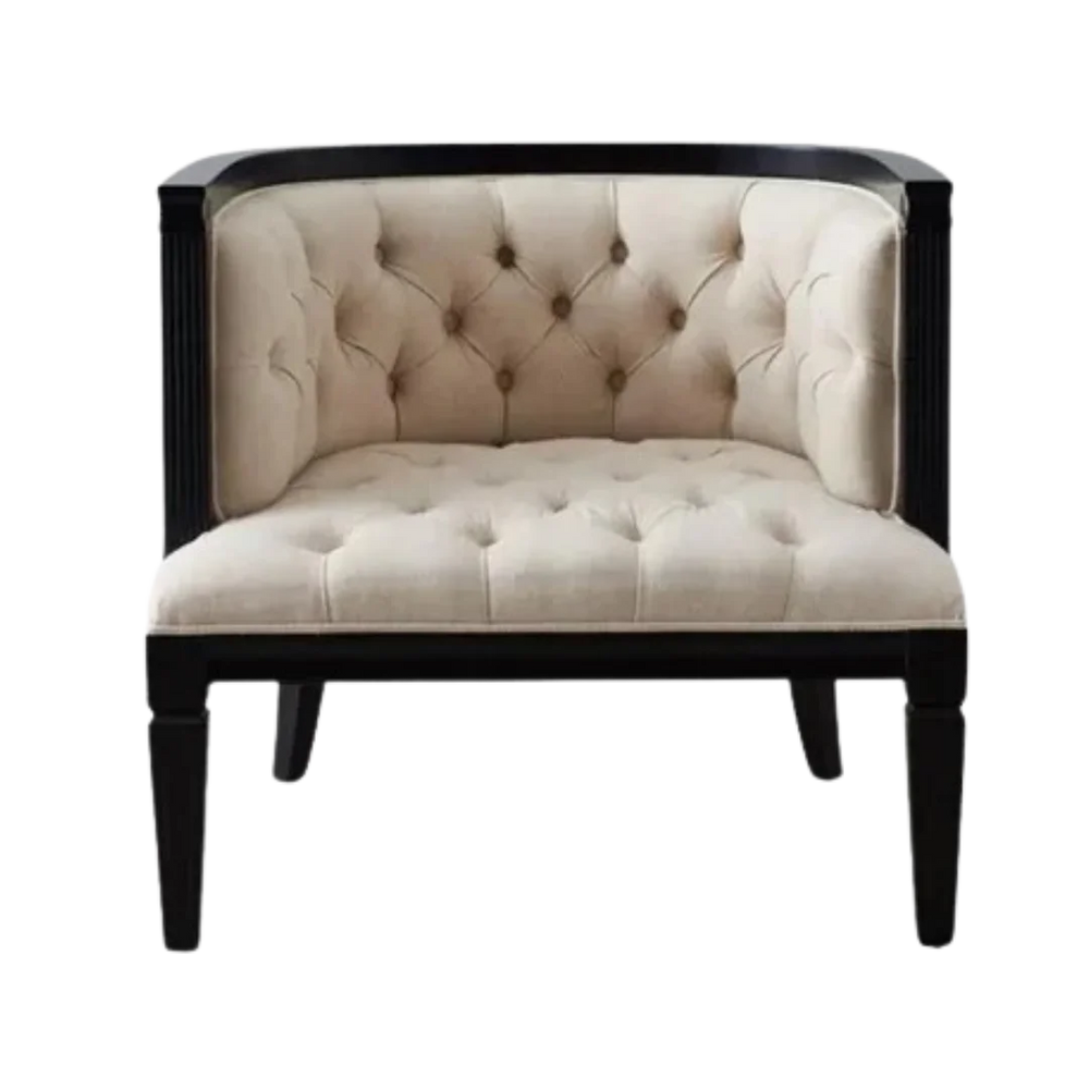 The Sienna Lounge Chair shows a beautiful mix of jet black wood and soft beige fabric. The rich black frame outlines the soft tufted seat, which creates a stylish two-color look that fits well in both modern and classic homes. This strong color match highlights the bold design of the chair. The black side panels, seat frame and legs match nicely with the calm beige color, which gives the chair a balanced and elegant look for living rooms. The dark polished wood also adds a soft shine that makes the chair look even better. This two-color style makes it easy for the chair to fit into both dark and light-colored rooms.