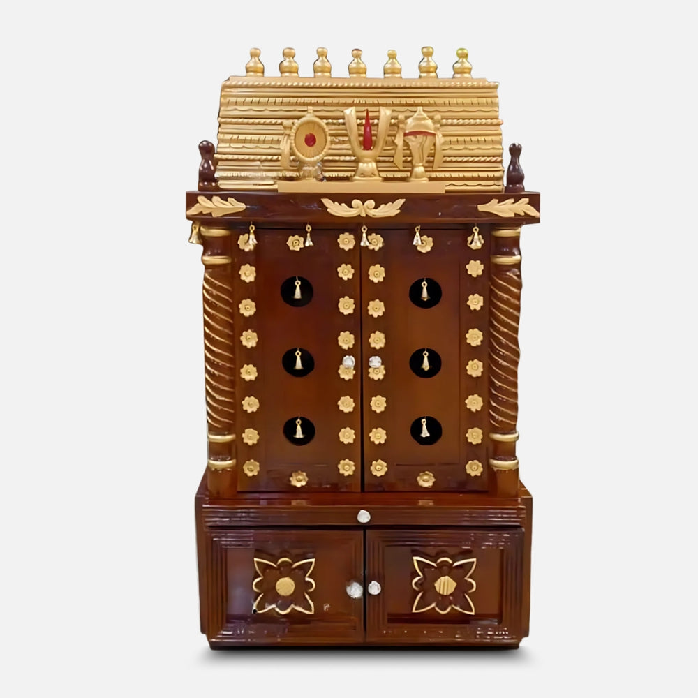The doors and panels are decorated with floral decorations that add beauty to it. These shapes are a sign of beauty and optimism. The design of the petals is carved. The flowers are further defined by the golden highlights. They add energy to the temple. This kind of art work adds holiness to the mandap. It transforms the temple into a masterpiece of traditional craftsmanship. The frame is made more textured and three dimensional through the carvings. The temple is linked to nature by floral designs. They turn this pooja mandap into a prominent big wooden temple. The floral decoration finishes the traditional decoration of the temple in a graceful manner.