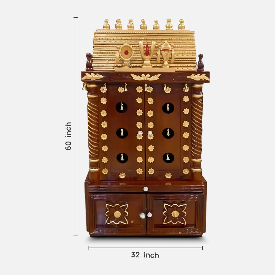 The Simha Teak Wood Mandap is a superbly crafted large wooden temple that is suitable to those who appreciate tradition and beauty in their homes. The golden detailing combined with its rich brown color makes it a display piece of divine nature that can be a focal point of any prayer area. This teakwood pooja mandap is distinctive due to its detailed carvings, decorative patterns and symmetrical design that are both functional and attractive. The top section is decorated with temple-related ornamentation whereas the lower area has storage cabinets and drawers to store prayer necessities. Its size is big enough to be an ideal big mandir to home so that it has ample majority of space to accommodate deities and puja set ups. Combining both its durability and artistry, this large wooden temple is perfect for those of the household who wish to have the combination of spirituality and design. Even the smallest detail of this mandap indicates perfect workmanship like the symbolic carving on its pillars and the floral symbolism in its doors. The gold highlights on the brown color foundation make it timeless in richness. This pooja mandap is made to last many years and is not only a divine provision, but also a decorative element.
