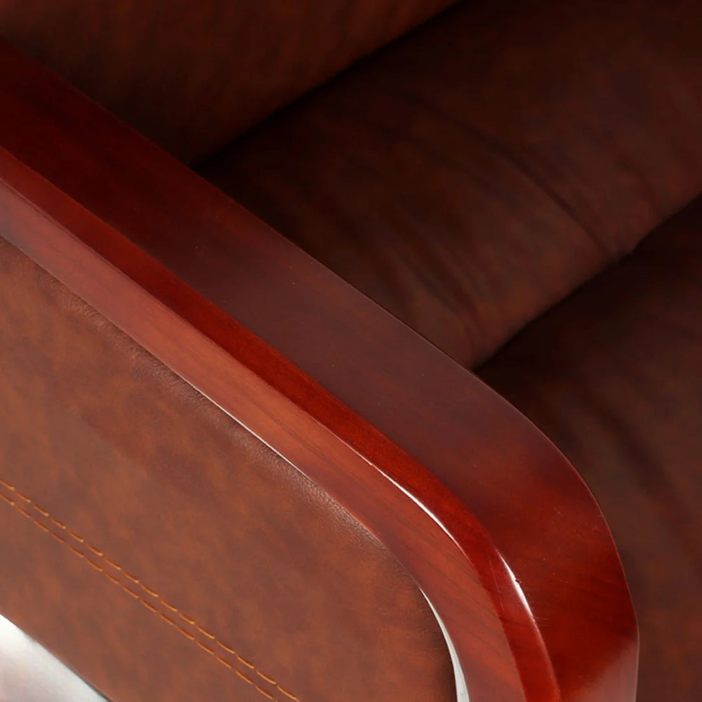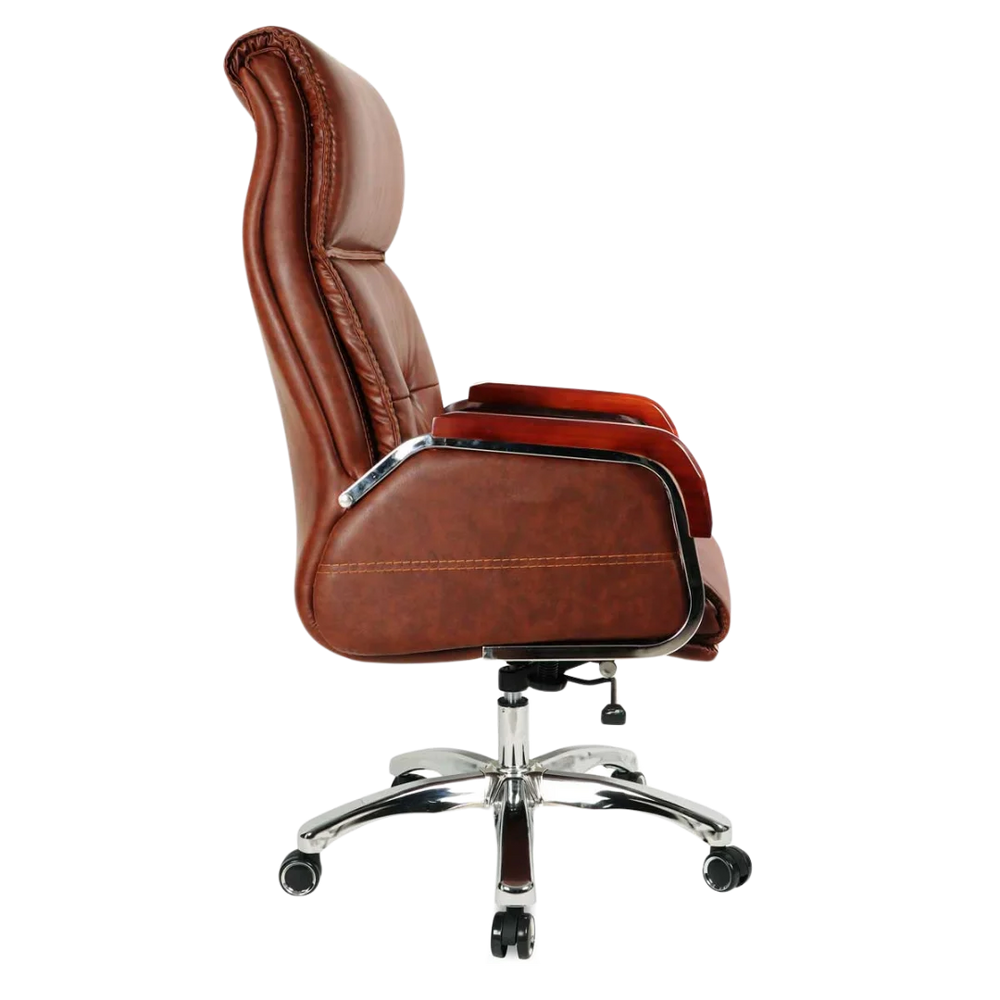 The backrest of this chair has two layers of soft padding that give it a bold and smart look. The top layer is slightly raised and works like a headrest. The middle part of the backrest has neat stitching that makes the shape clear and stylish. The lower back area is padded and gently pushed out to support your spine. The straight stitch lines give the chair a clean and formal look, which is perfect for offices. The wide shoulder design matches the chair’s shape and helps you sit comfortably. The brown artificial leather adds a warm and rich feel. This backrest gives both good posture support and a nice look.
