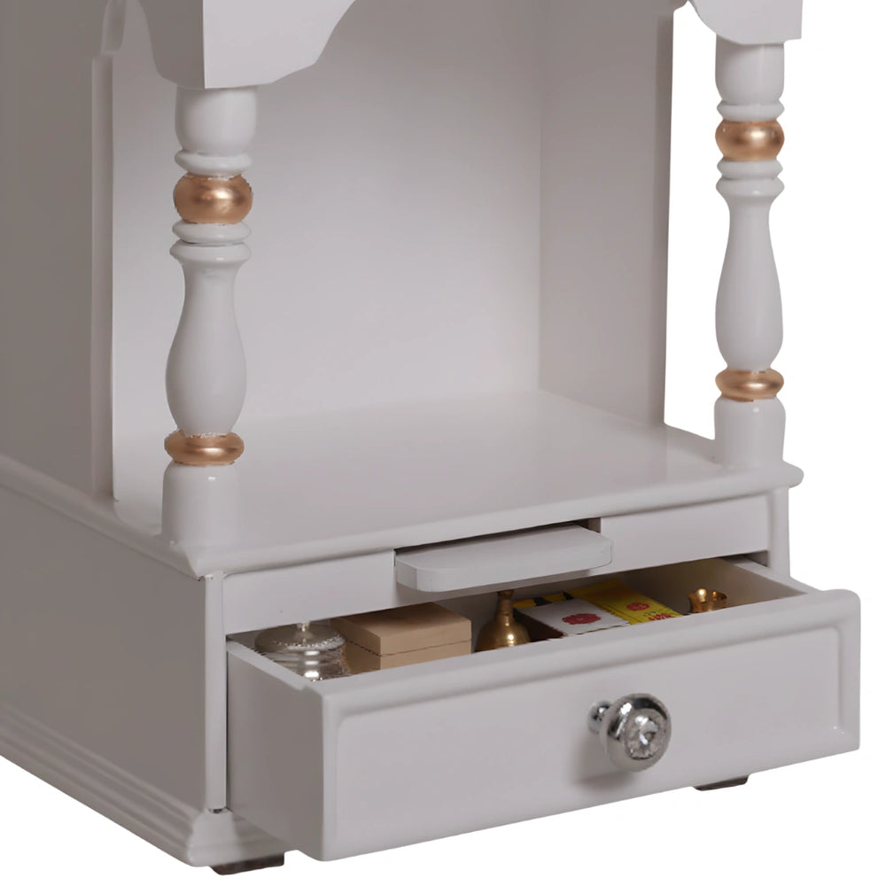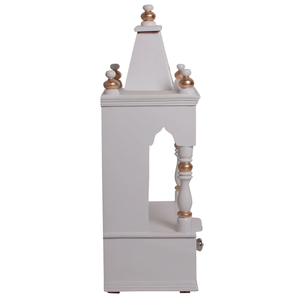 It is also made with the finest teakwood that mixes with the glossy finish to give a white gold colour that impresses you and provides the perfect stage to build your spiritual connection and pray to the Gods. It comes with useful features like a spacious drawer and a detachable tray that make it a beautiful and practical mandir for your home.