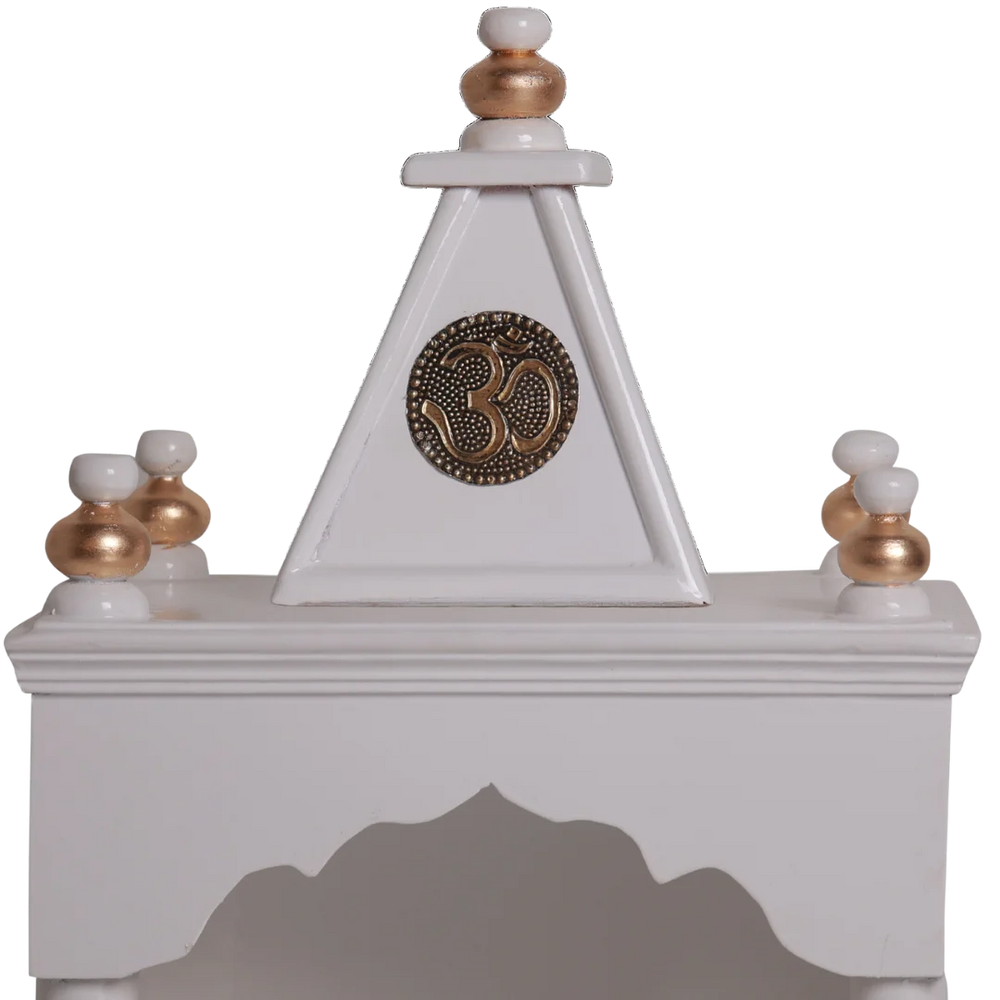 The Sphatika mandir is a small, beautifully designed mandir that brings peace and spiritual energy to your home. This wall mandir design has sophisticated craftsmanship to assist you on your spiritual journey while taking up minimal space in the house. Made from the finest teakwood, it naturally showcases a beautifully white gold color that elevates your home’s spiritual atmosphere. This small temple is crowned with a spiritual dome that contains the Om symbol that is inspired by ancient Indian temples. The pillars are handcrafted with beautiful designs and provide strong support. The temple design allows a mixture of sunlight and shadows to accent the beauty of the deities. It has a convenient detachable tray to place your incense sticks and diyas. This small mandir also provides space to hold the deities respectfully along with a spacious drawer to hold pooja supplies. This small pooja mandir will be a source of spiritual energy for your home.